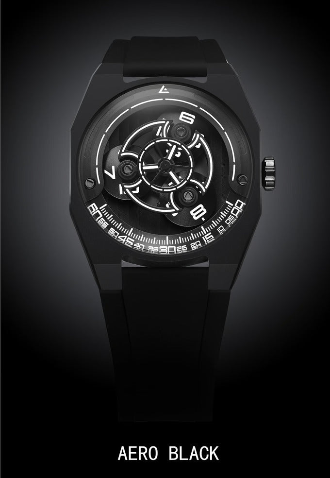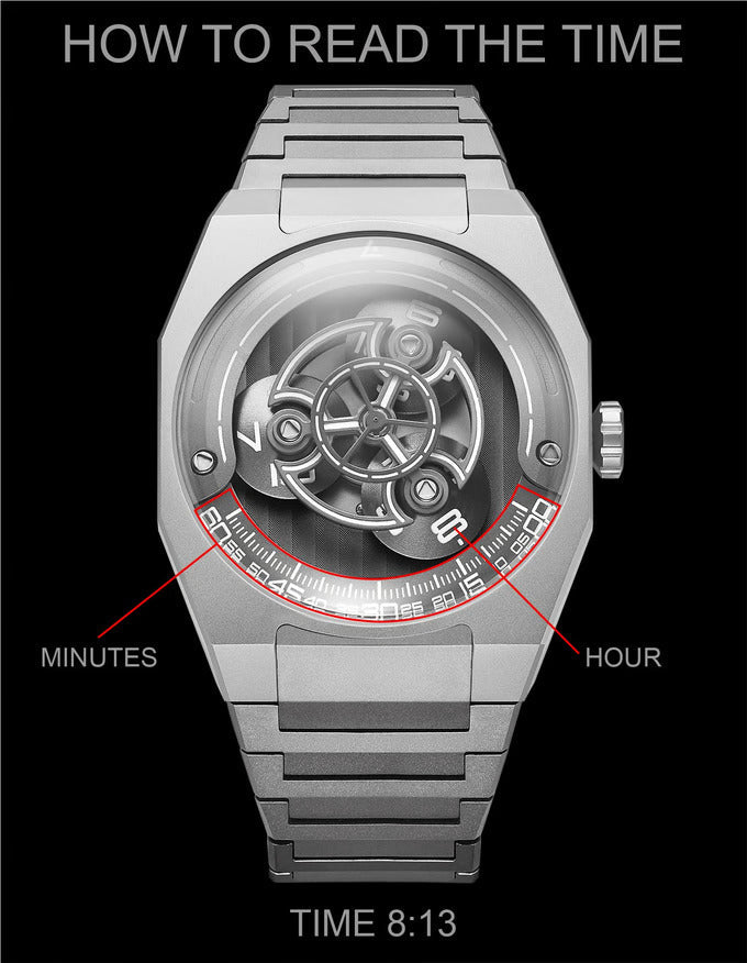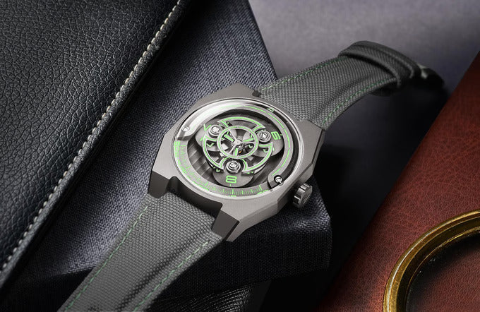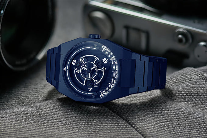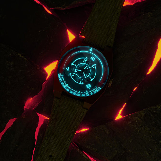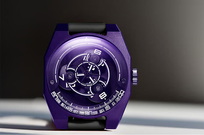 - Wijzerplaat: Titanium armen, geanodiseerde aluminium flens en schijven, en wijzerplaat met Genève-motief. Cijfers, minuten en indexen bekleed met Swiss Super-Luminova™.