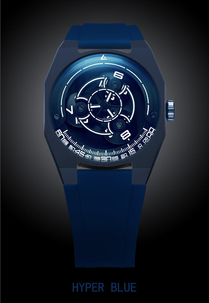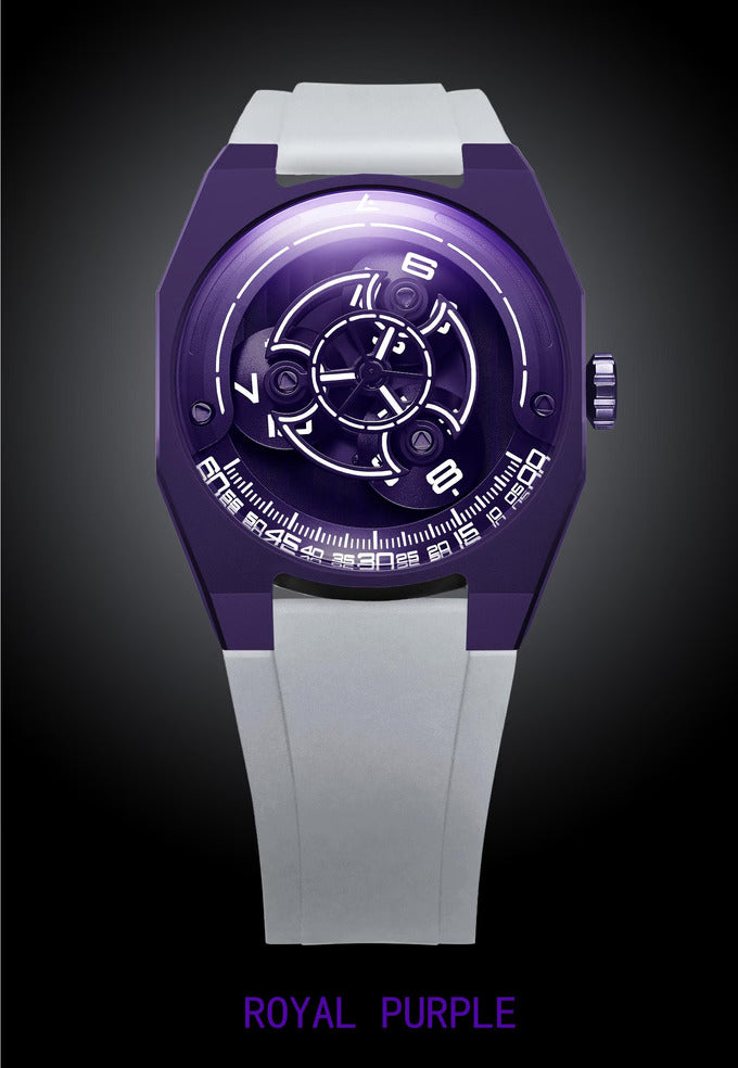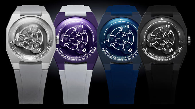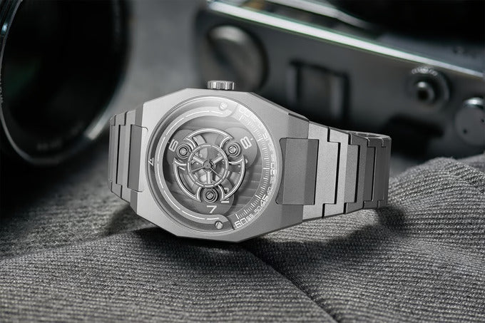De Angles KOI-5 is een gelimiteerde, zwervende klok , geïnspireerd op het fascinerende KOI-5-sterrenstelsel in het sterrenbeeld Cygnus. Met drie roterende schijven imiteert dit automatische herenhorloge het hemelse ballet van de drie zonnen, een tijdsweergave die doet denken aan een kosmische dans.