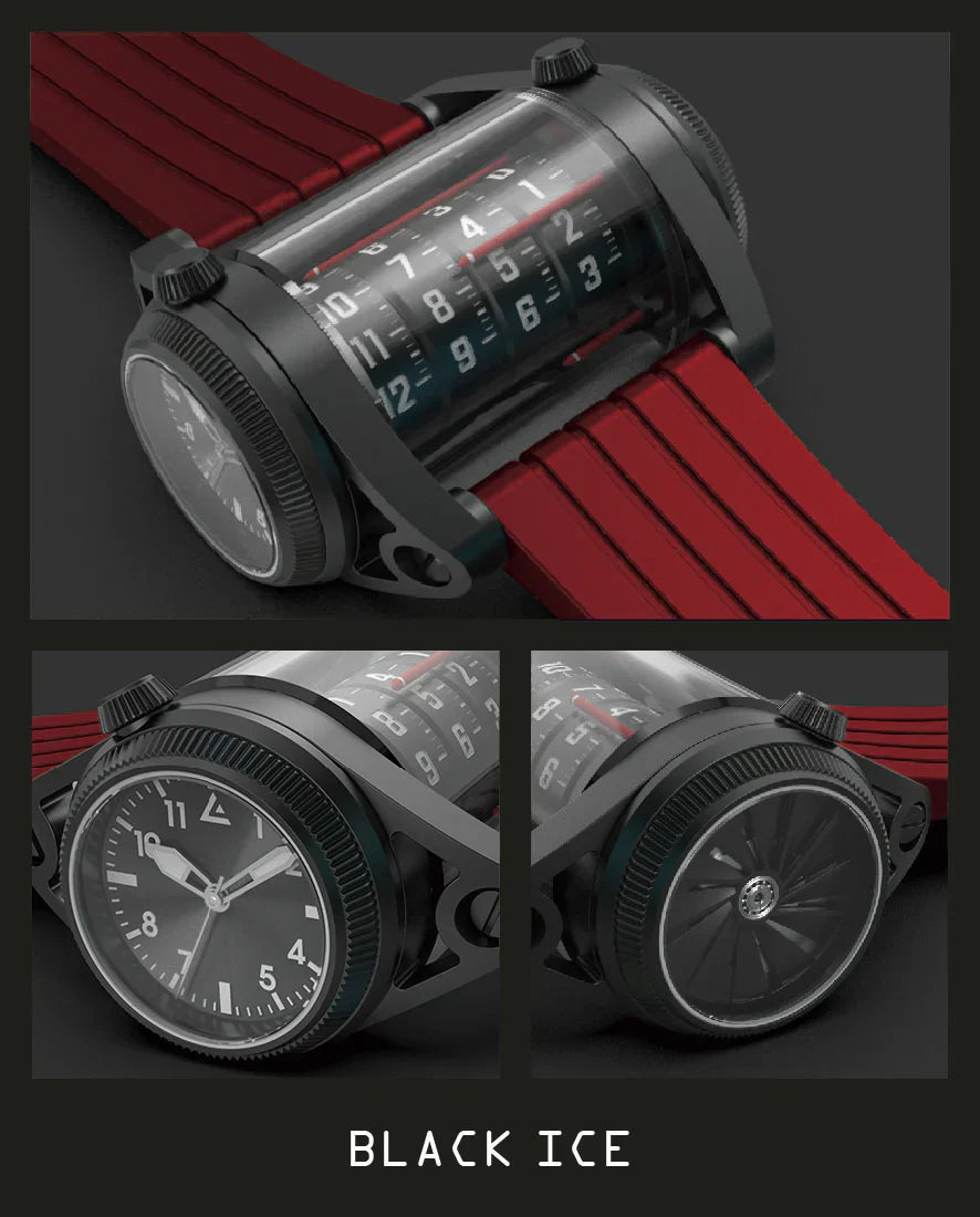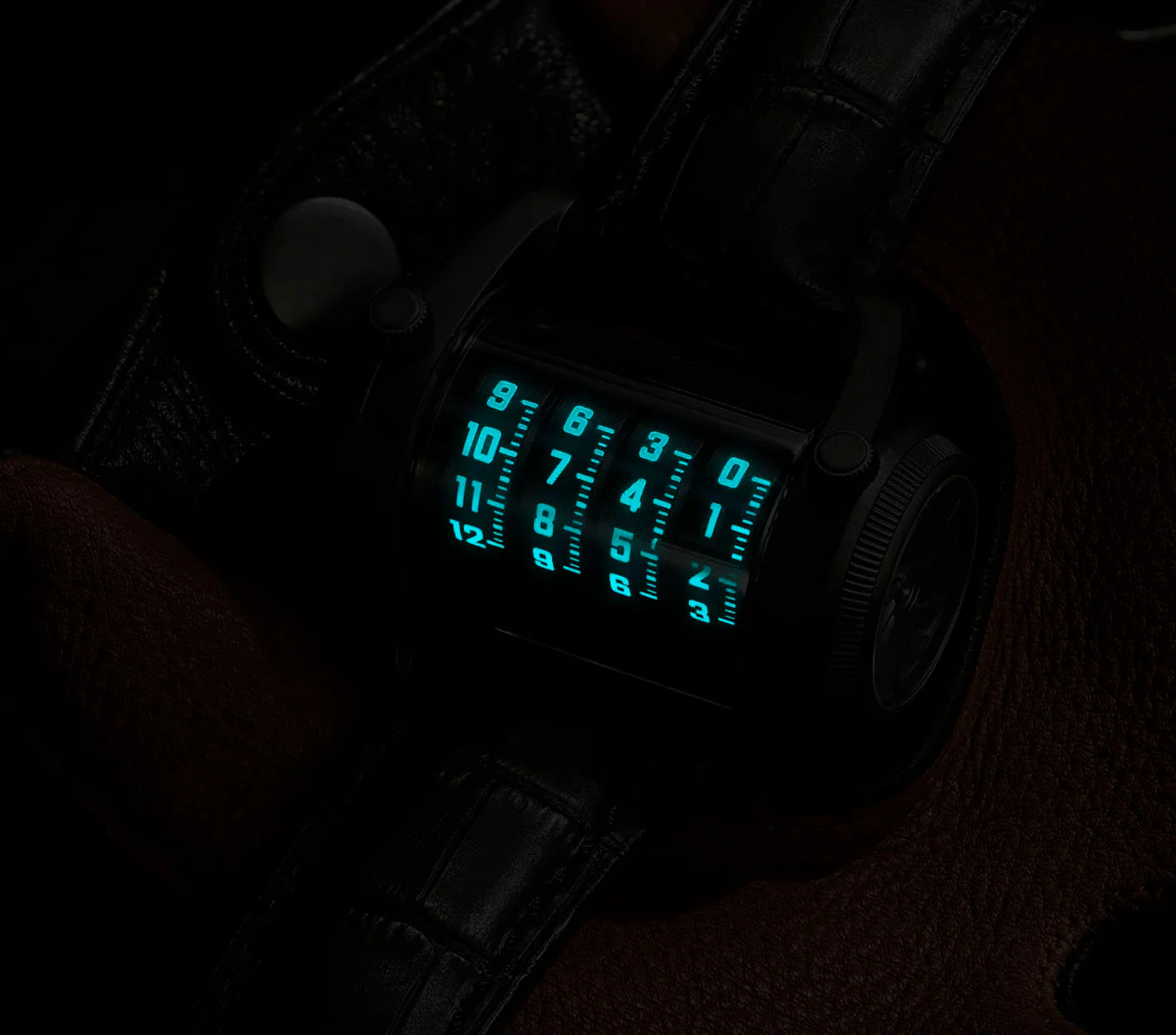 Zwarte wijzerplaten met rode geanodiseerde aluminium wijzers op de cilindrische wijzerplaat met witte BGW9 lichtgevende markering op het uiteinde.