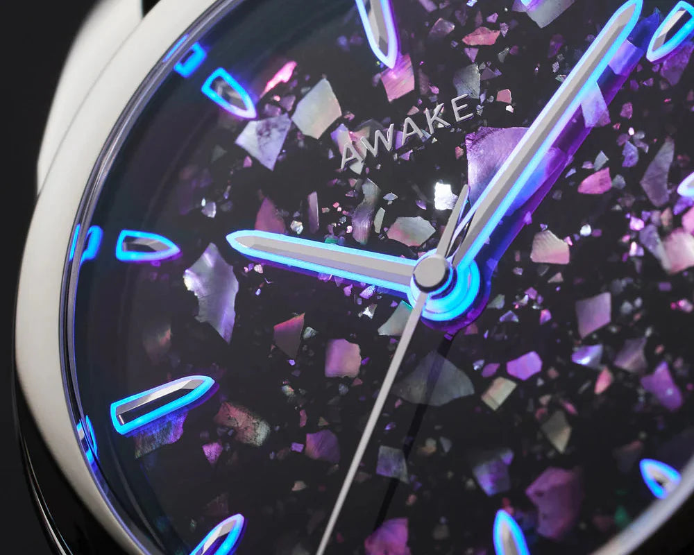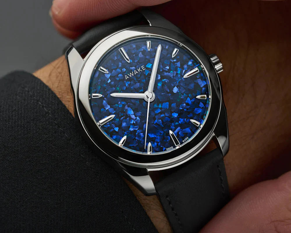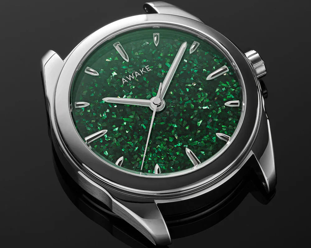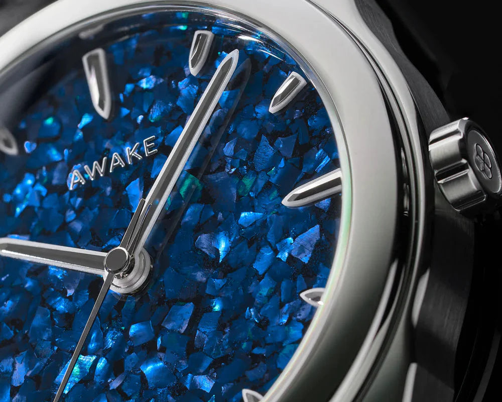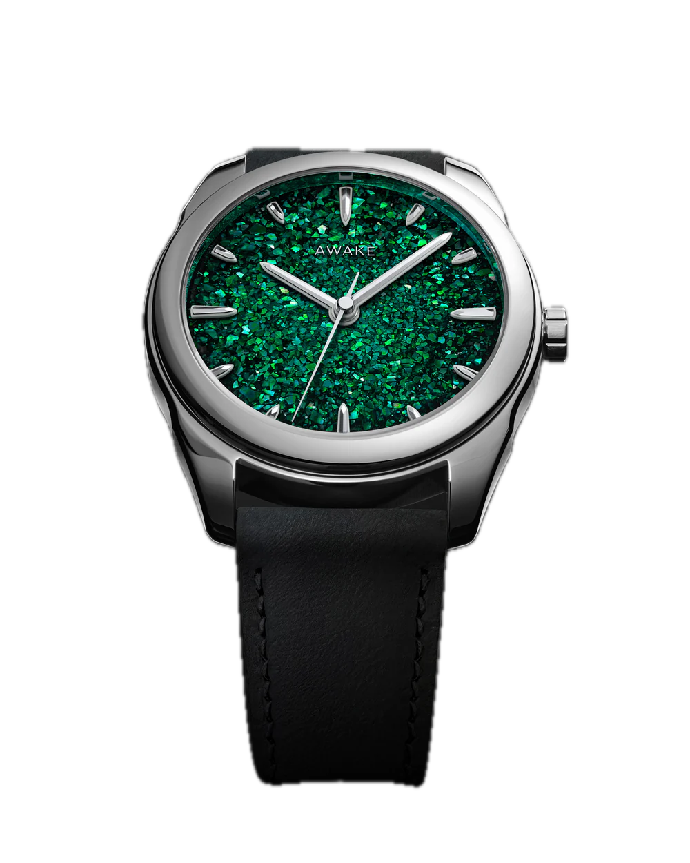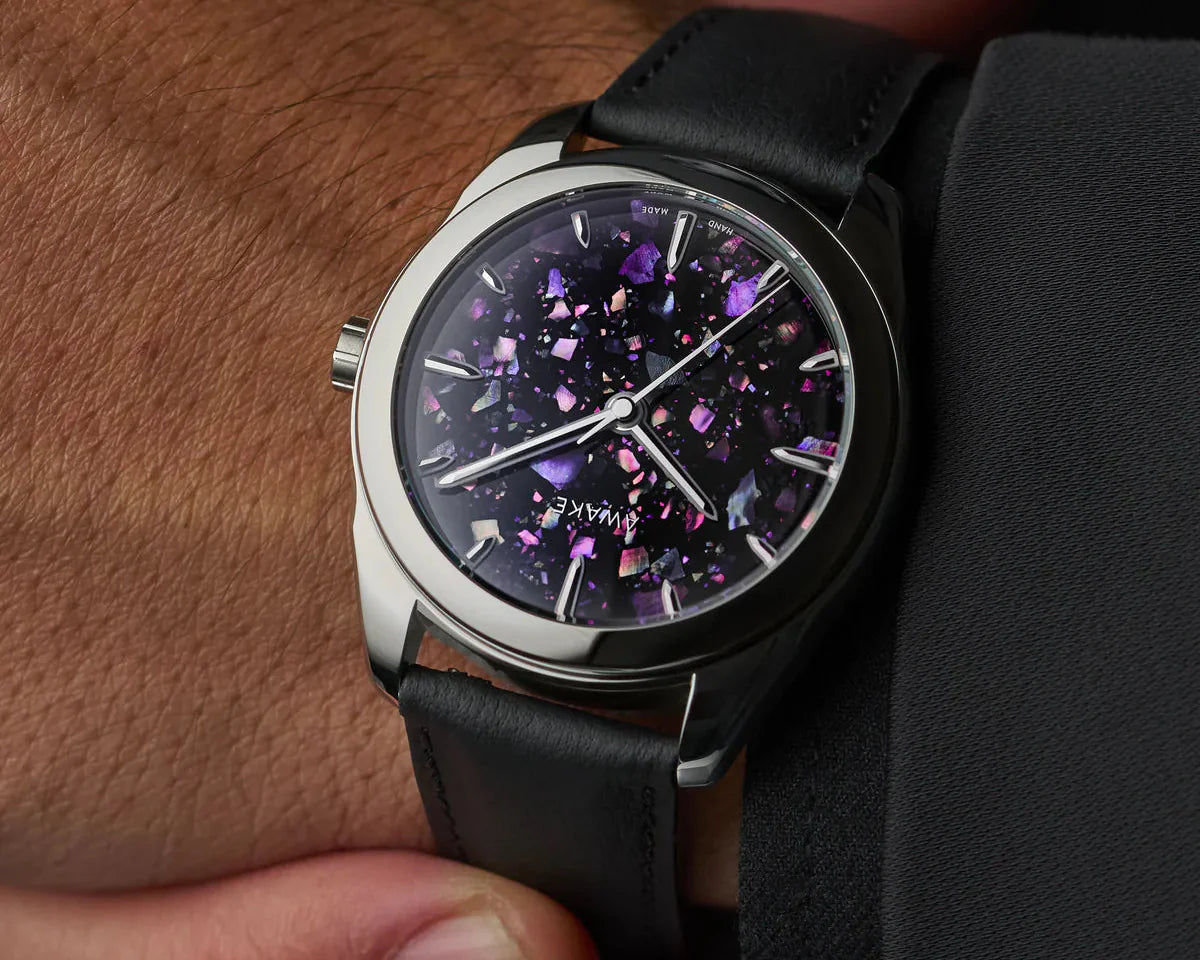 Chaque cadran est une œuvre d’art unique, façonnée à la main à partir de fragments de matériaux naturels. Le boîtier en acier recyclé 316L, le mouvement automatique La Joux-Perret G101 et le bracelet cuir Jean Rousseau témoignent d’un artisanat d’exception et d’une approche durable.