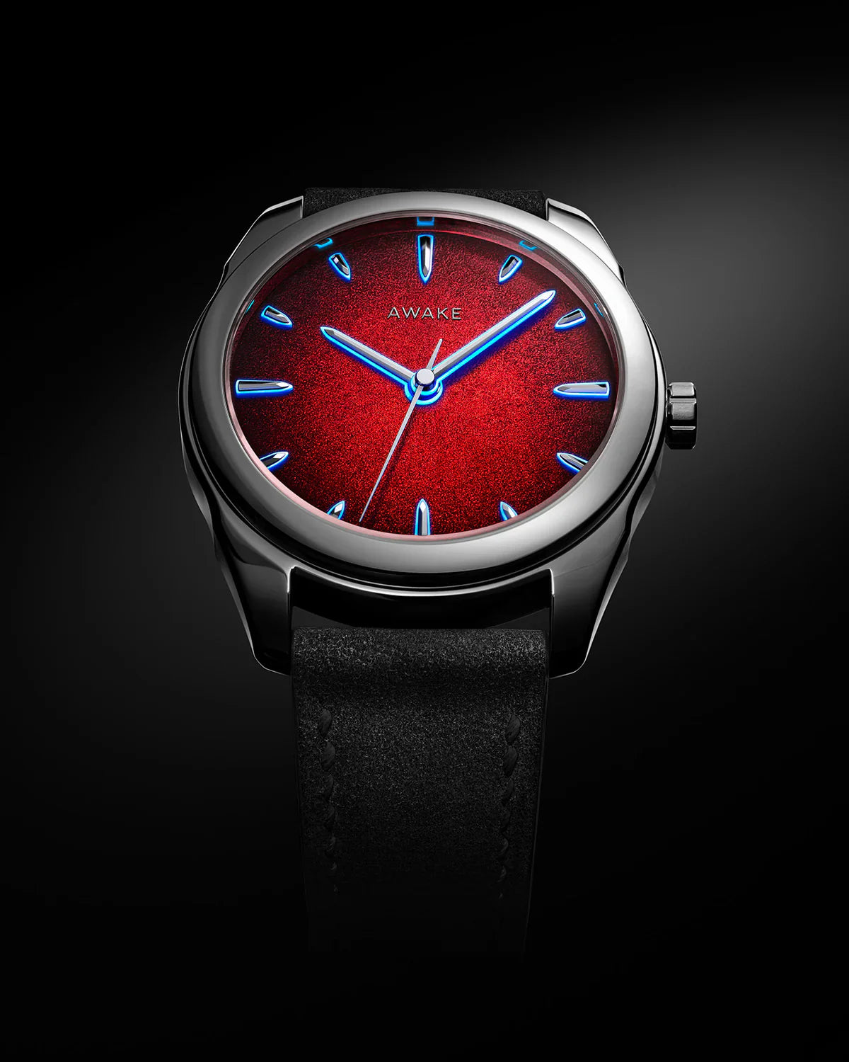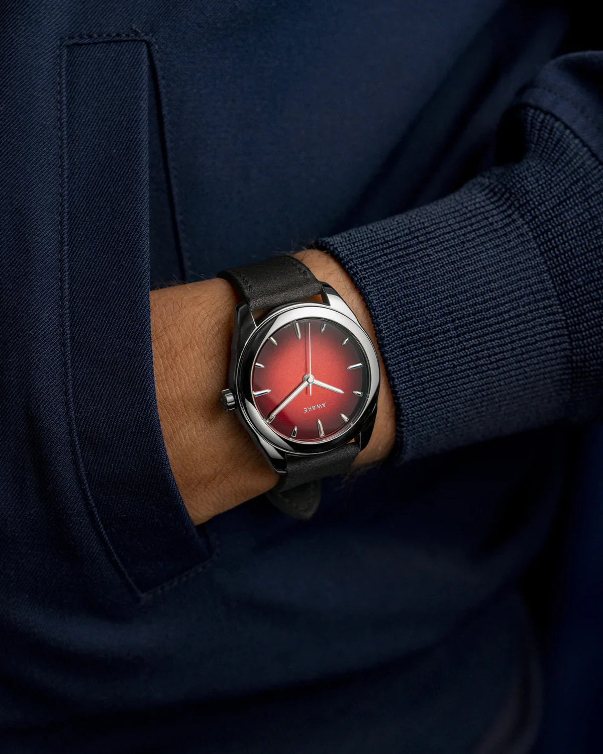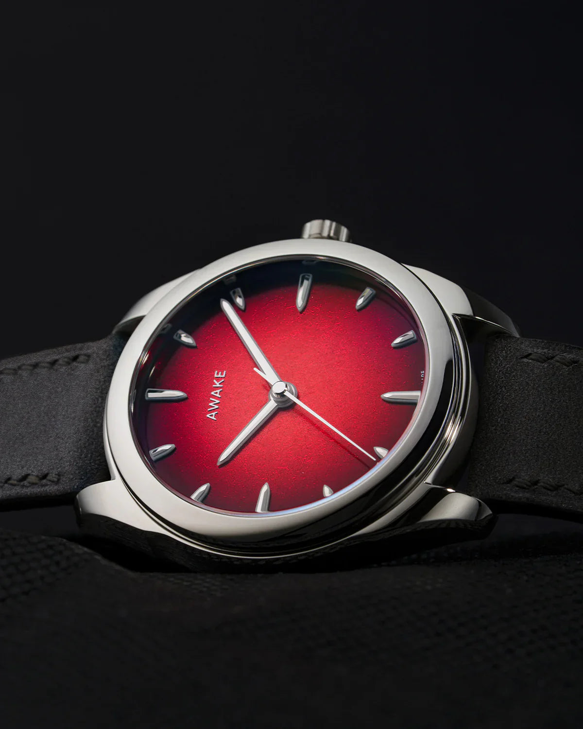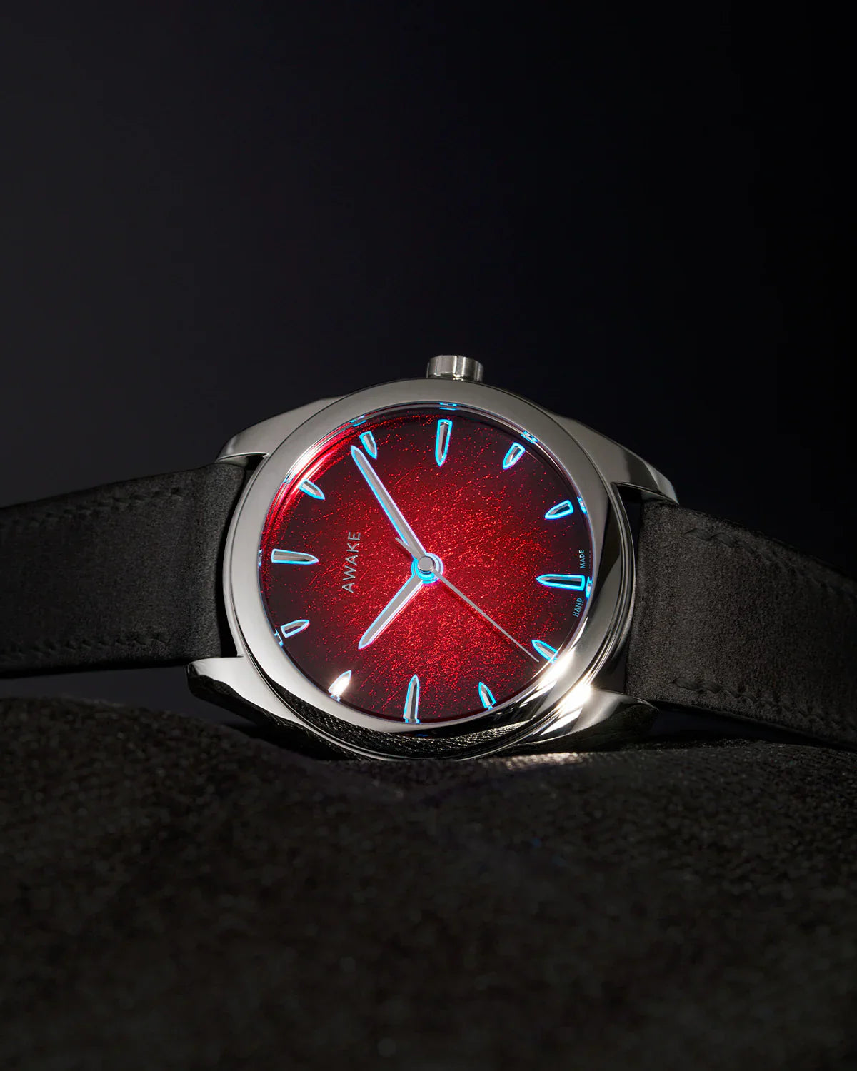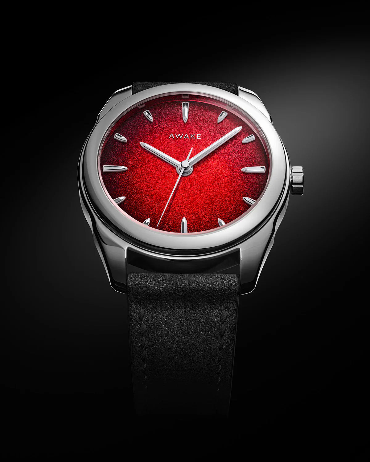 Profond et provocateur, le rouge carmin a traversé le temps comme symbole de passion, de courage et de séduction. Ici, il se décline en nuances intenses, du rouge éclatant au noir profond, donnant naissance à un cadran puissant et stimulant. Sa profondeur et ses reflets captivent irrésistiblement le regard, insufflant à celui qui le porte énergie et vitalité.