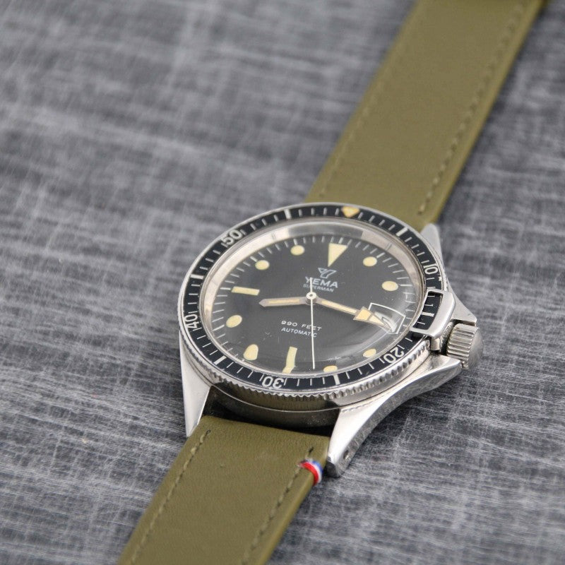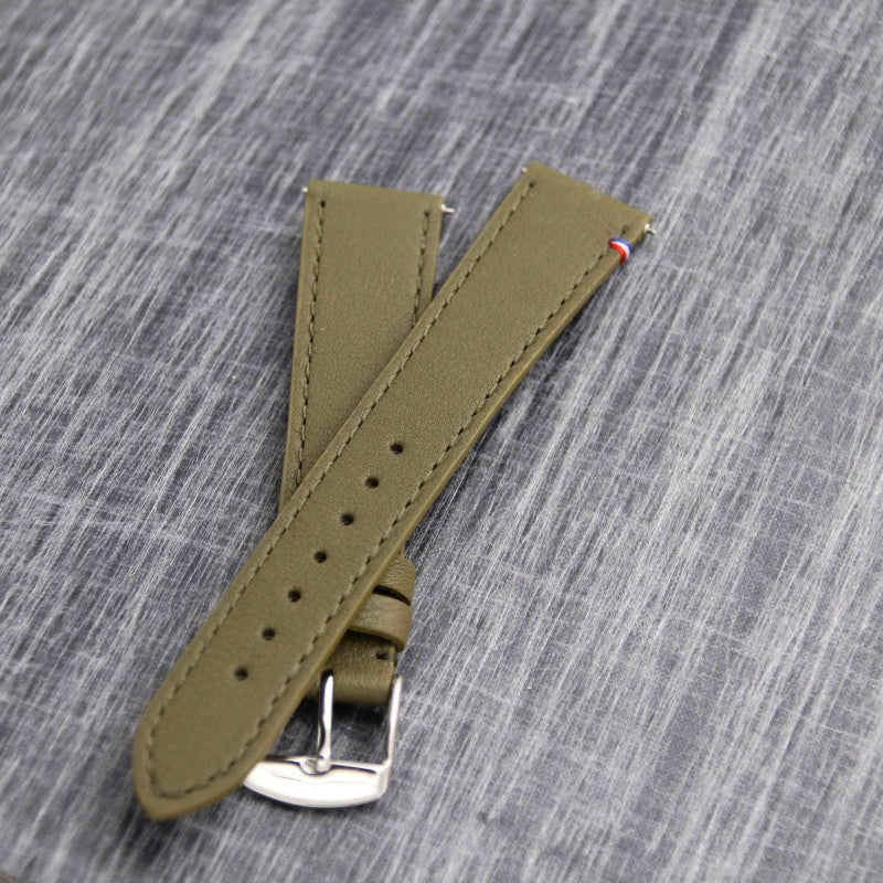 Een extra platte, volnerf leren band met een nubuck voering, met een tijdloos klassieke look en subtiel geaccentueerd met onze beroemde "blauw, wit, rood" stiknaad. De SAINT BRIAC, in kaki, zal zowel uw stadshorloge als uw favoriete duikhorloge opfleuren! Hij is uitgerust met flashveren voor een snelle en eenvoudige installatie!