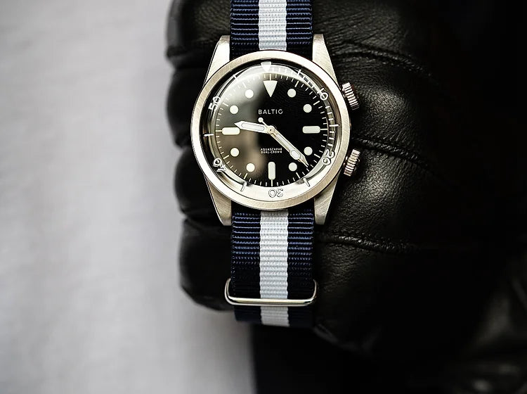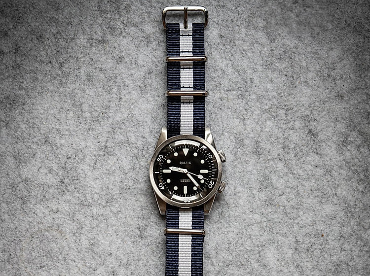 De blauw-witte NATO-band heeft een chique en strakke stijl. NATO-bandjes staan bekend om hun robuustheid en verwisselbaarheid en zijn sindsdien een echt mode-statement geworden.