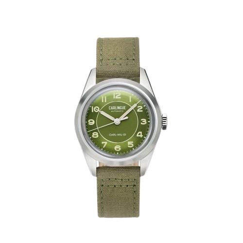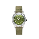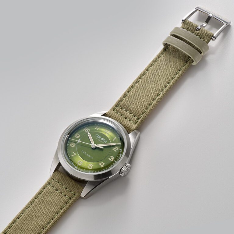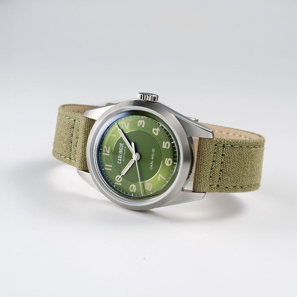 - Band: verwisselbaar, in kakigroen katoenen canvas, gevoerd met leer voor comfort en stijl.