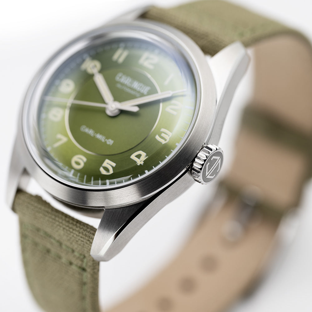 - Wijzerplaat: Gewelfd en sectorvormig in olijfgroen, met een ronde matte en satijnen afwerking die diepte accentueert. De Arabische cijfers zijn geschilderd en de indexen en wijzers zijn voorzien van Swiss Super-LumiNova® voor perfecte afleesbaarheid, zelfs in het donker.