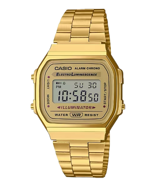 Deze modellen combineren een origineel design van 40 jaar geleden met moderne technologie. De opvallende gouden retrostijl maakt dit polshorloge tot een stukje designgeschiedenis. De typische digitale weergave biedt naast de tijd ook praktische alledaagse functies zoals de kalender, de sabotagefunctie en het alarm.