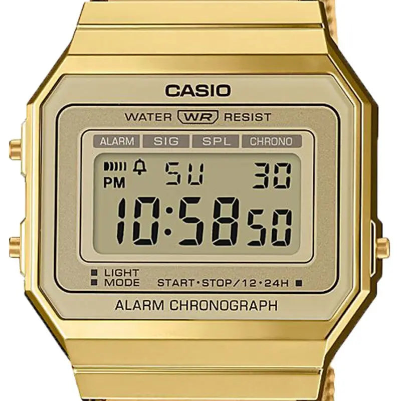 De Casio Vintage A700WEMG-9AEF valt op door zijn levendige design en praktische dagelijkse gebruik. Met zijn opvallende gele kleur en achthoekige harskast trekt hij de aandacht, maar is hij toch licht en duurzaam. Het digitale led-display, de alarmen en de chronograaf maken dit horloge een ideale keuze voor wie op zoek is naar een model dat zowel functioneel als modieus is.