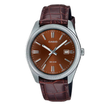 De Casio Timeless MTP-1302PL-5AVEF is een stijlvol en klassiek horloge met een bruine sunburst wijzerplaat, die een prachtige interactie met het licht creëert. De messing kast, versierd met een gecanneleerde lunette, geeft het een vleugje verfijning, terwijl de bruine runderleren band met stiksels comfort en stijl toevoegt. Uitgerust met een betrouwbaar Japans quartz-uurwerk biedt dit horloge perfecte afleesbaarheid dankzij de lichtgevende wijzers en "Neobrite" indexen. Met een waterbestendigheid van 5 atmosfeer is het geschikt voor dagelijkse activiteiten en licht zwemmen. De zilveren sluiting en elegante afwerking maken het een veelzijdig en chic horloge voor elke gelegenheid.