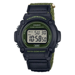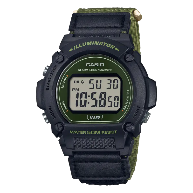 De Casio Vintage W-219HB-3AVEF is een unisex digitaal horloge met een sportief en praktisch design, ideaal voor heren. Met zijn felgroene wijzerplaat en groene stoffen band valt hij op door zijn moderne en robuuste look. De 47 mm harskast zorgt voor lichtheid en stevigheid, en biedt een uitzonderlijke levensduur met een gangreserve van 7 jaar . Dit horloge is uitgerust met een zeer nauwkeurige stopwatch (1/100e seconde), een alarm , een ledlampje voor zichtbaarheid in het donker en is waterbestendig tot 5 atmosfeer . De groene stoffen band met verstelbare klittenbandsluiting zorgt voor optimaal comfort en eenvoudige aanpassing.