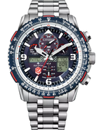 La Promaster Skyhawk A-T de Citizen est une montre d’aviation ultra complète conçue pour les voyageurs et amateurs de haute technologie. Avec synchronisation radio (atomic timekeeping) pour 43 villes, sa fonction chronographe 1/100 s, son calendrier perpétuel, ses doubles fuseaux horaires, ses alarmes et son compteur à rebours, elle offre un panel de fonctions très riche. Son mouvement Eco-Drive (alimenté par la lumière) élimine le besoin de remplacer la batterie, et son boîtier robuste assure une étanchéité de 200 m.
