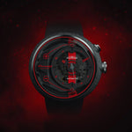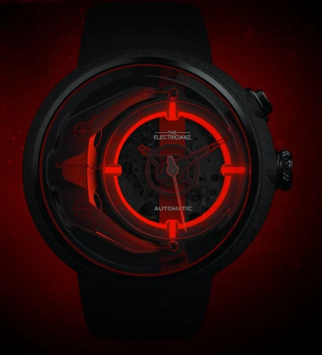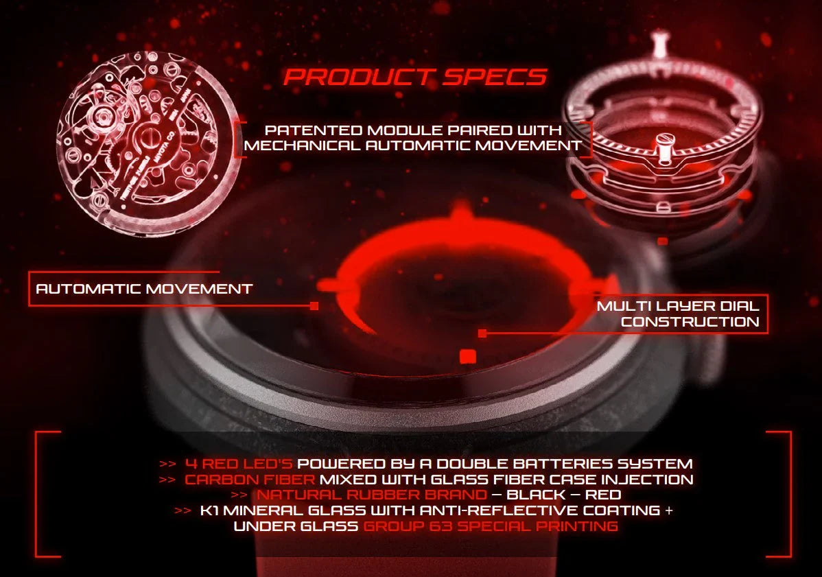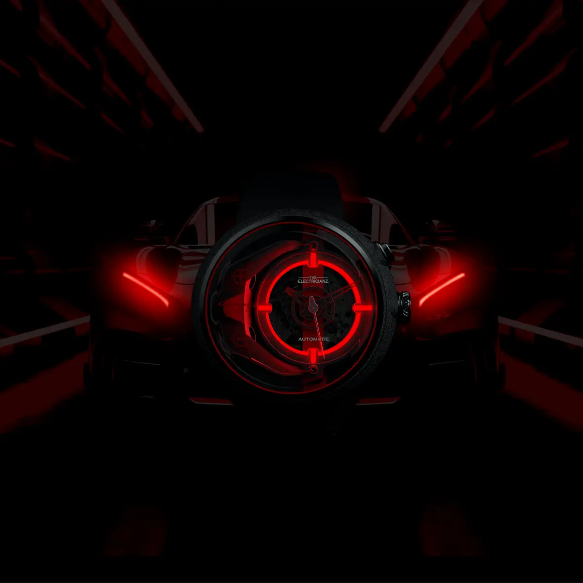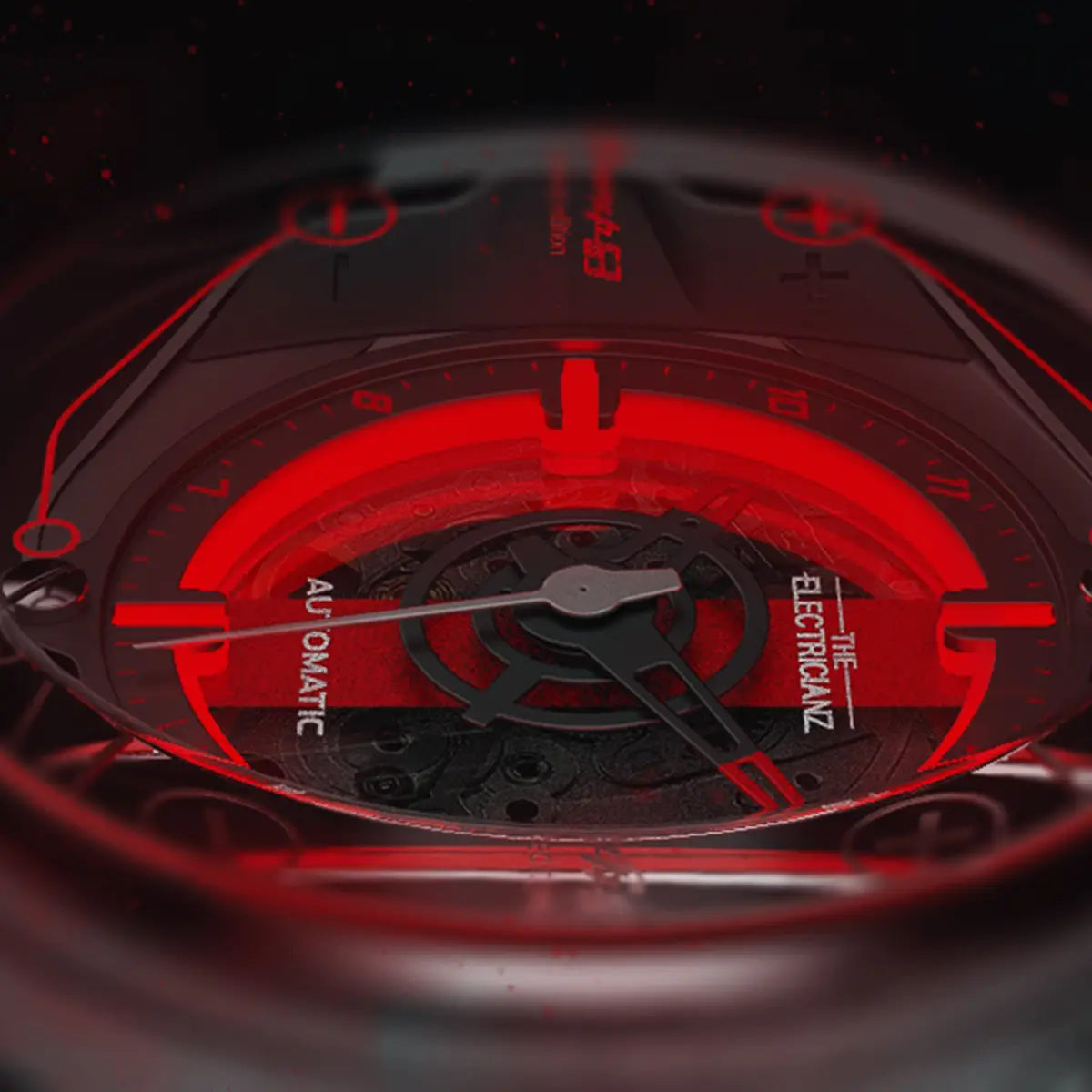 De semi-transparante meerlaagse wijzerplaat herbergt ELZ's gepatenteerde elektrische module, gecombineerd met een Miyota 82S0 mechanisch uurwerk. Een dubbele lithiumbatterij voedt het 8-led-achtergrondverlichtingssysteem, dat een stralend rode tint uitstraalt.