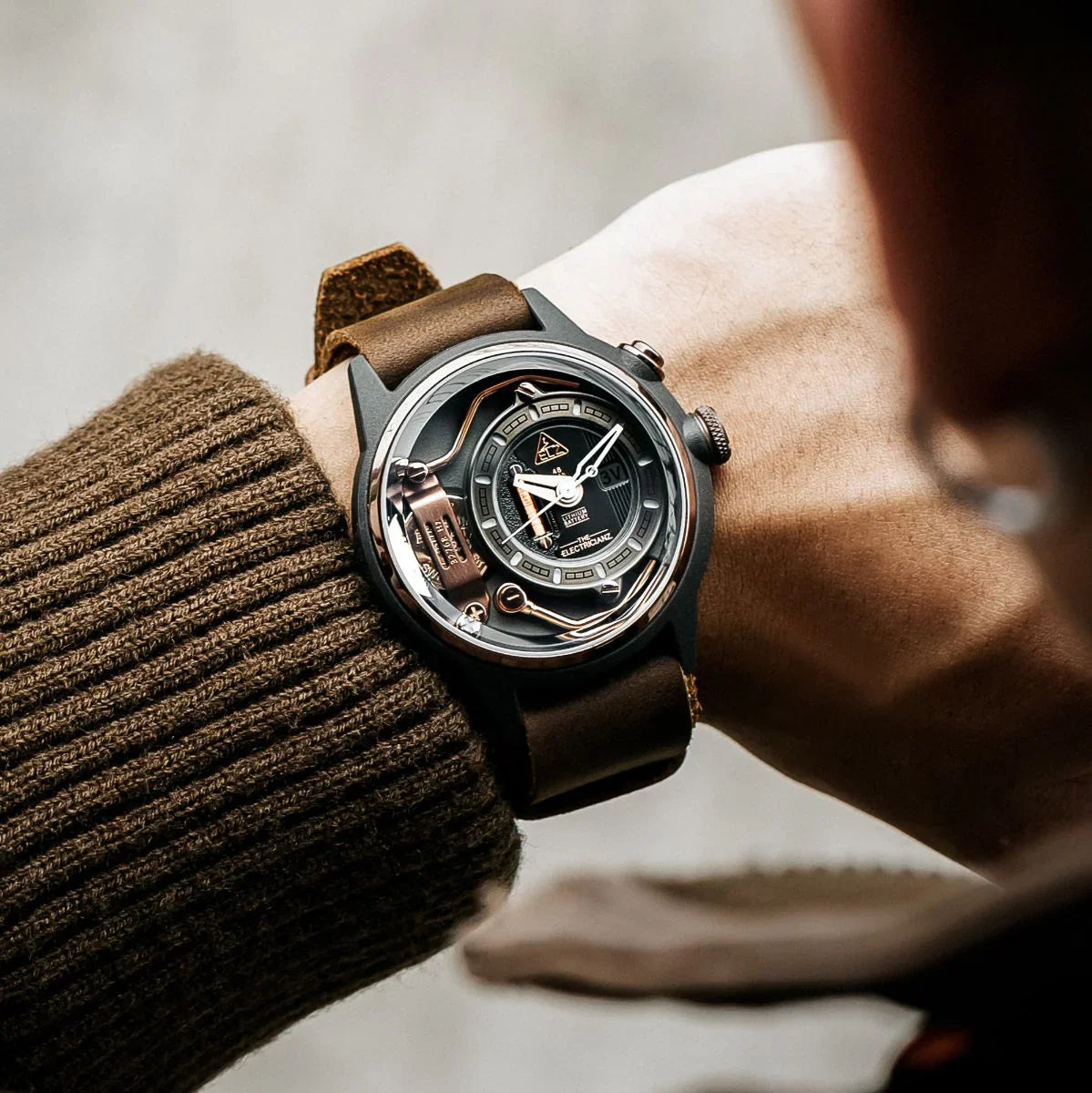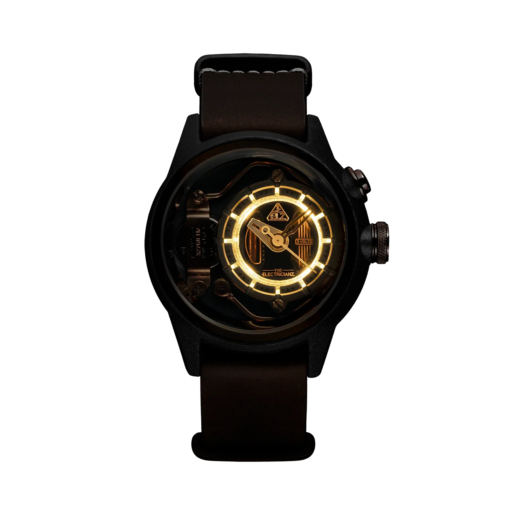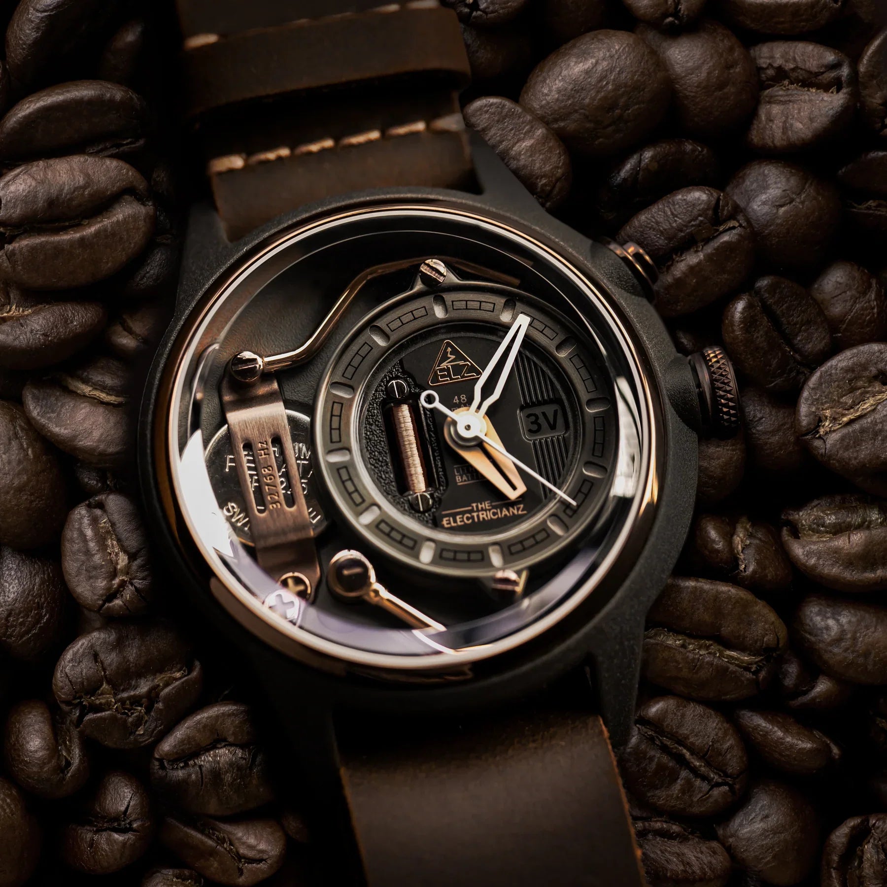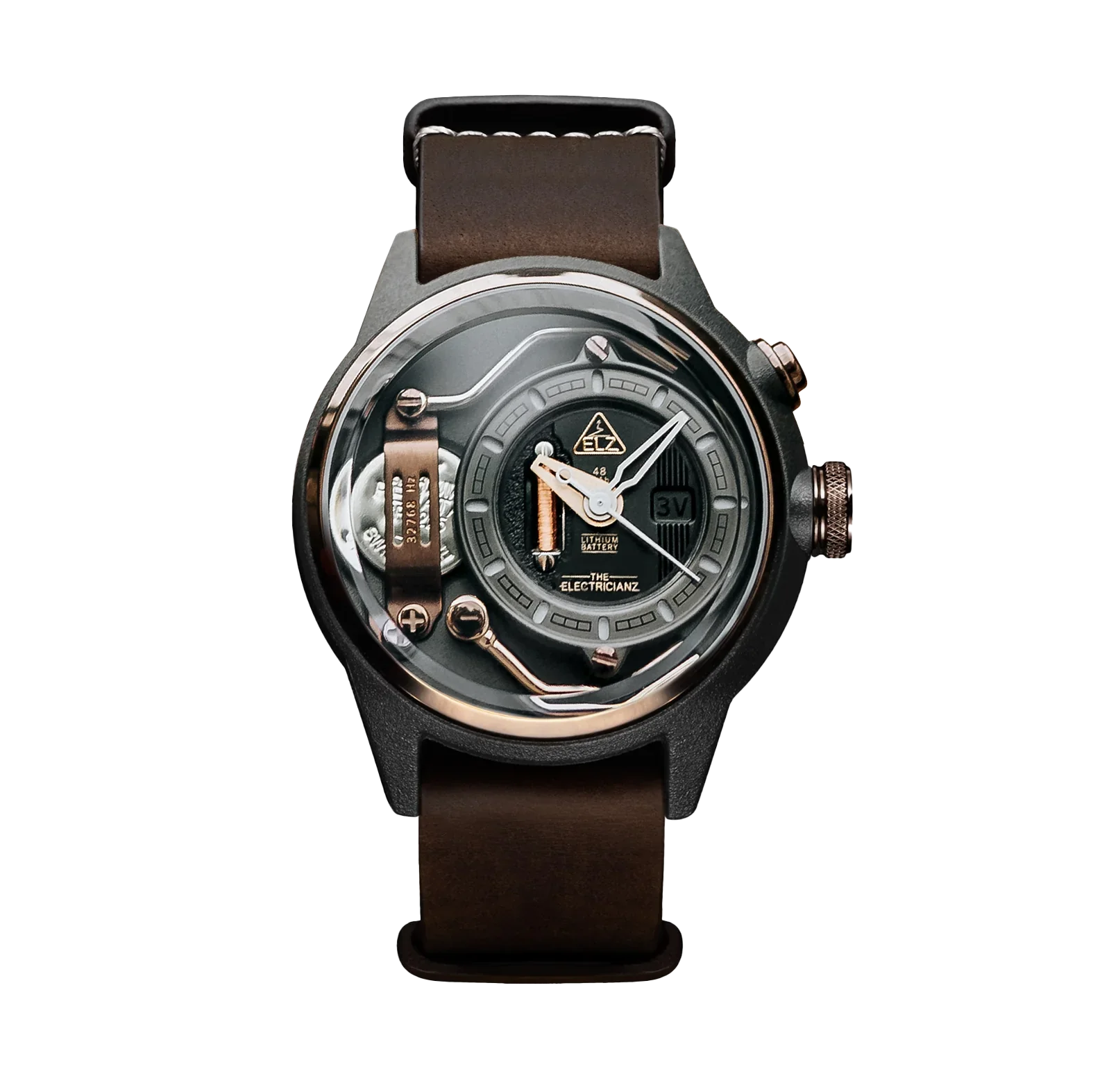 De Mokaz: Weelderig fluweelzacht leer omhult de delicate kast van de Mokaz. De herfstkleuren versterken op elegante wijze het volume van het horloge en benadrukken de diepte en rondheid. Het is een echte Electricianz, en 's nachts toont hij zijn volle kracht. U bent gewaarschuwd!
