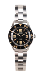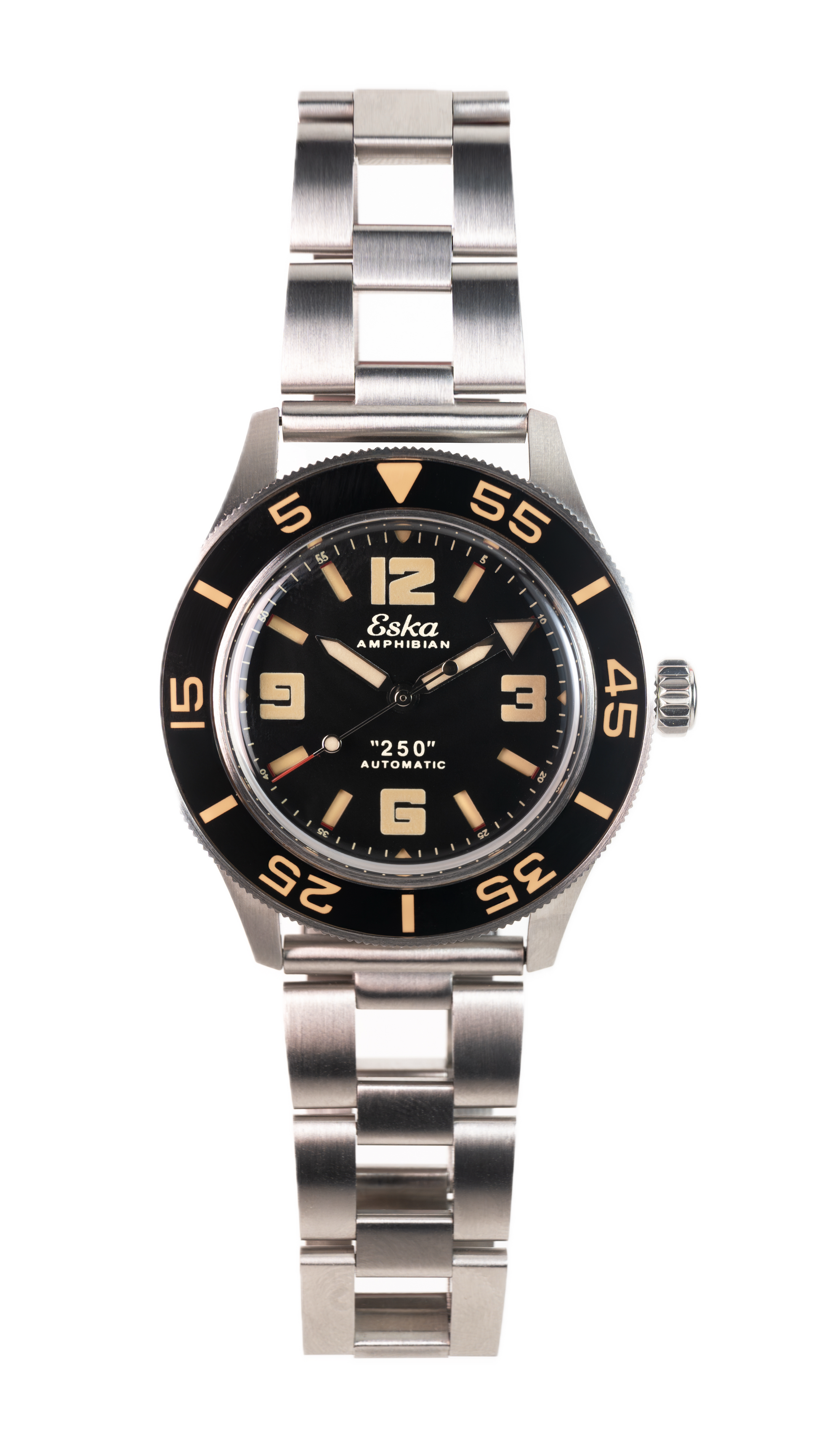 L’Eska Amphibian 250-BS “Black Shark” est une plongeuse au caractère affirmé. Avec son boîtier acier poli et brossé de 40 mm, son cadran noir sandwich “oversized” et ses éléments de design sportifs (repères cardinaux surdimensionnés, lunette unidirectionnelle, index luminescents Super-LumiNova®), elle marie élégance et robustesse.