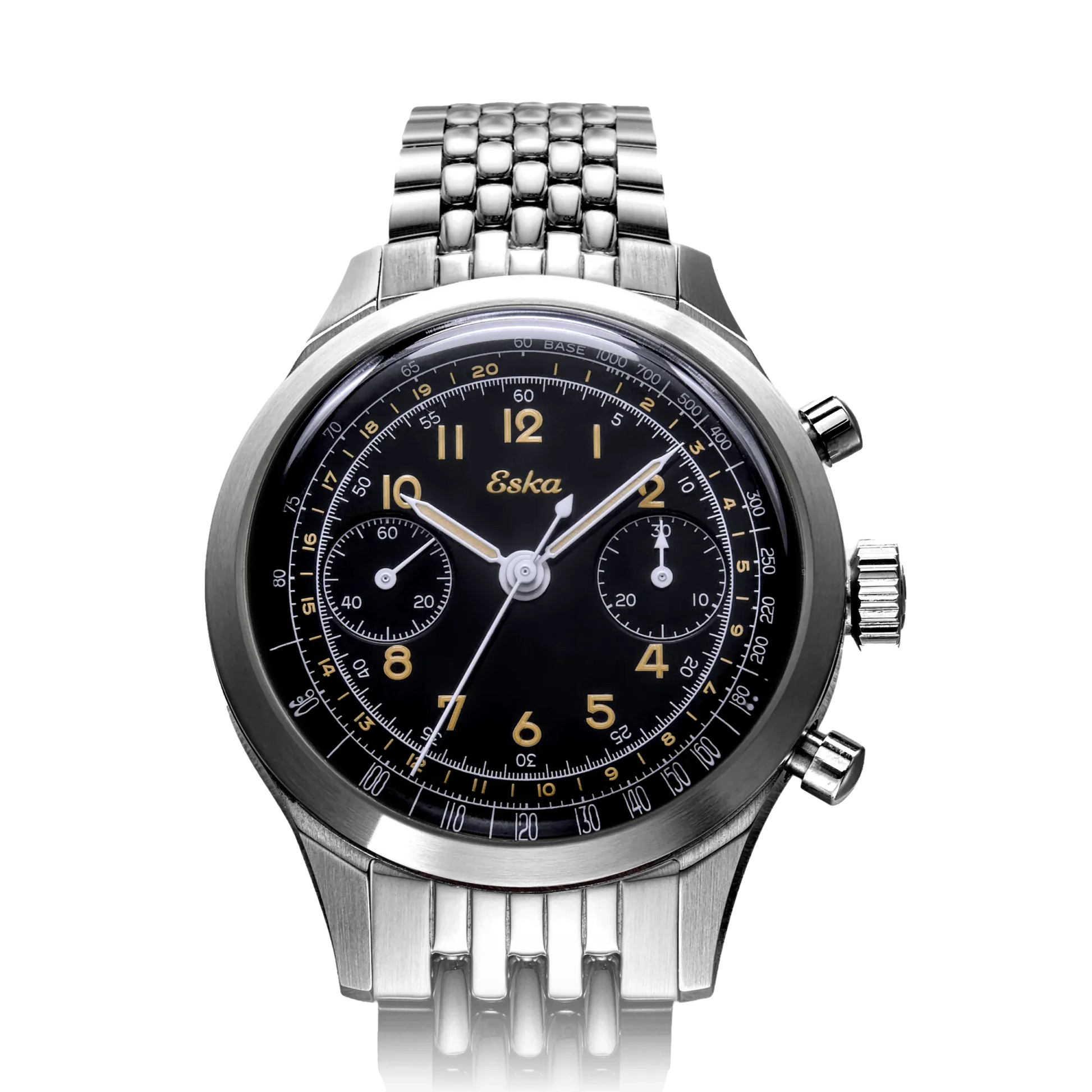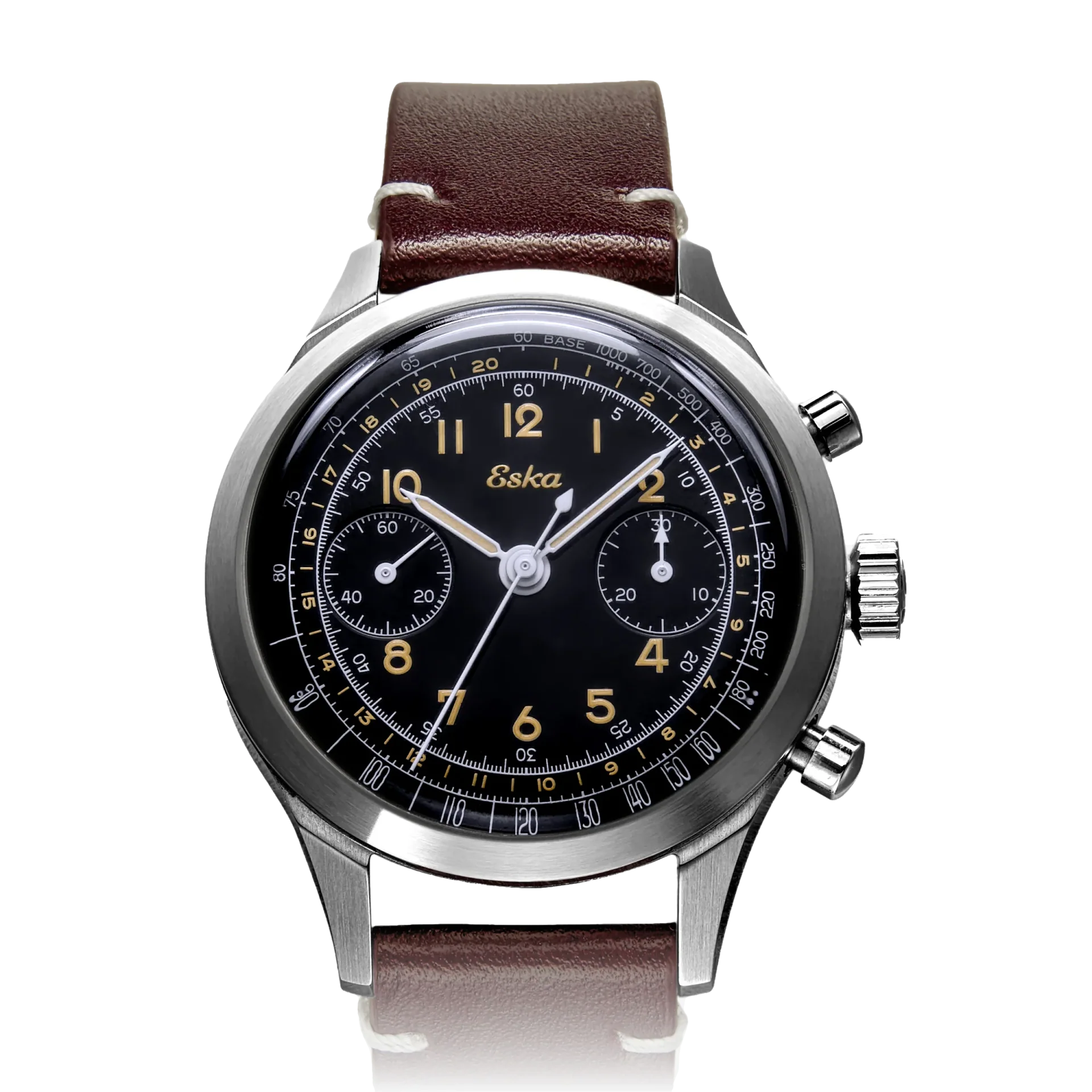 La ESKA Heritage SK25 Heritage Noir revisite l’esthétique des chronographes d’époque avec une élégance contemporaine. Son cadran émail noir à double niveau, ses compteurs bi-compax et ses détails luminescents lui confèrent un style viril et raffiné à la fois. Le calibre La Joux-Perret L113 à remontage manuel assure jusqu’à 60 heures de réserve de marche, visible à travers un fond saphir transparent.