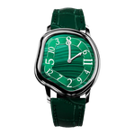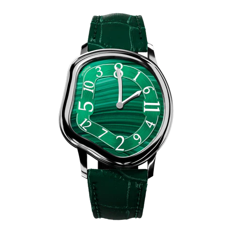 De Malachite Edition heeft een betoverende wijzerplaat, vervaardigd van echte malachiet. Malachiet staat bekend om zijn diepgroene tinten en wervelende patronen en is een symbool van transformatie en bescherming. Deze betoverende steen wordt al eeuwenlang gewaardeerd om zijn vermogen om verandering teweeg te brengen en te beschermen tegen negatieve energieën. Elke wijzerplaat is uniek en weerspiegelt de kenmerkende kunst van de natuur. Gecombineerd met een gepolijste titanium kast en bijpassende gepolijste titanium gesp, belichaamt deze editie luxe en empowerment.