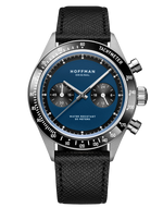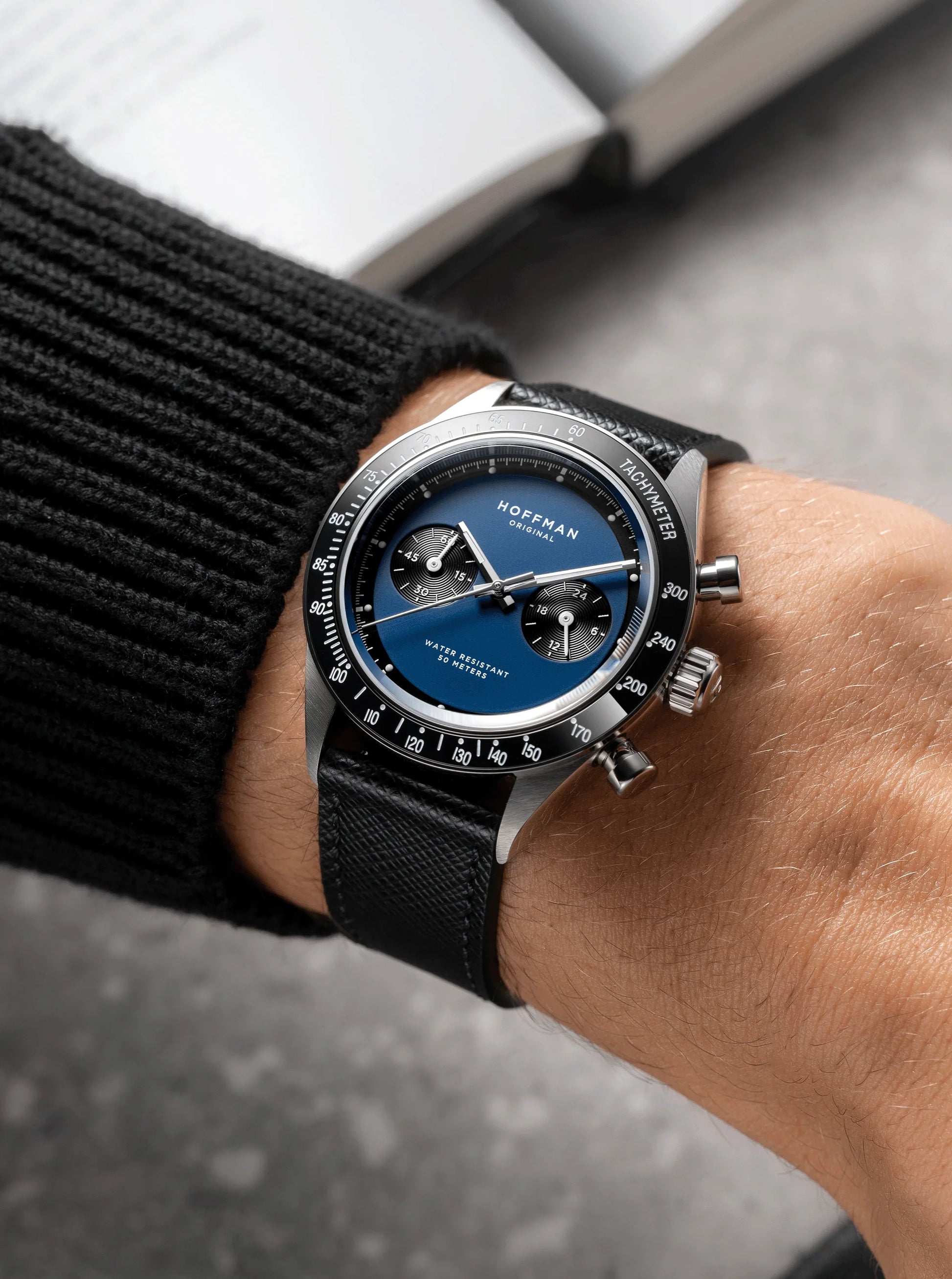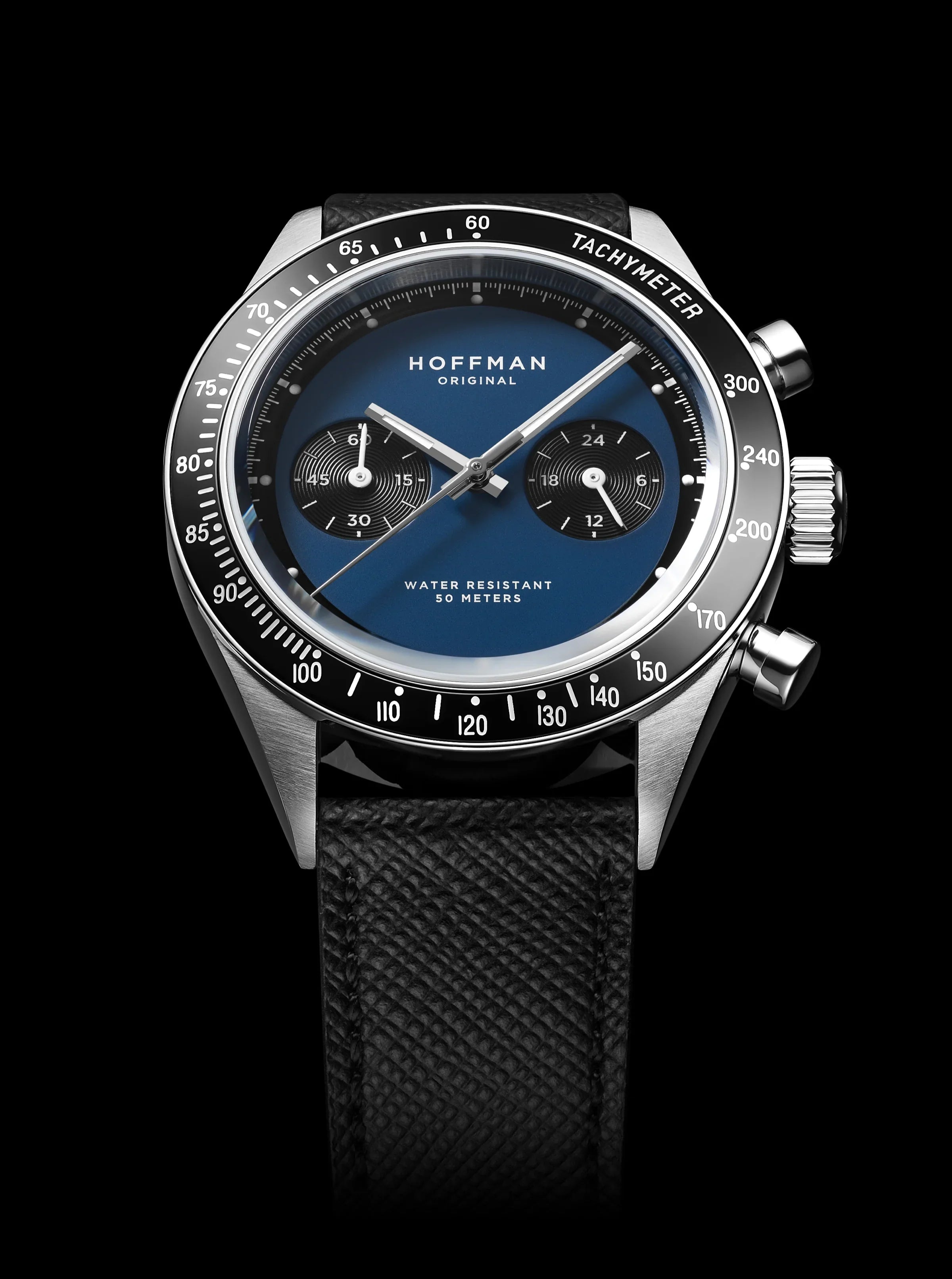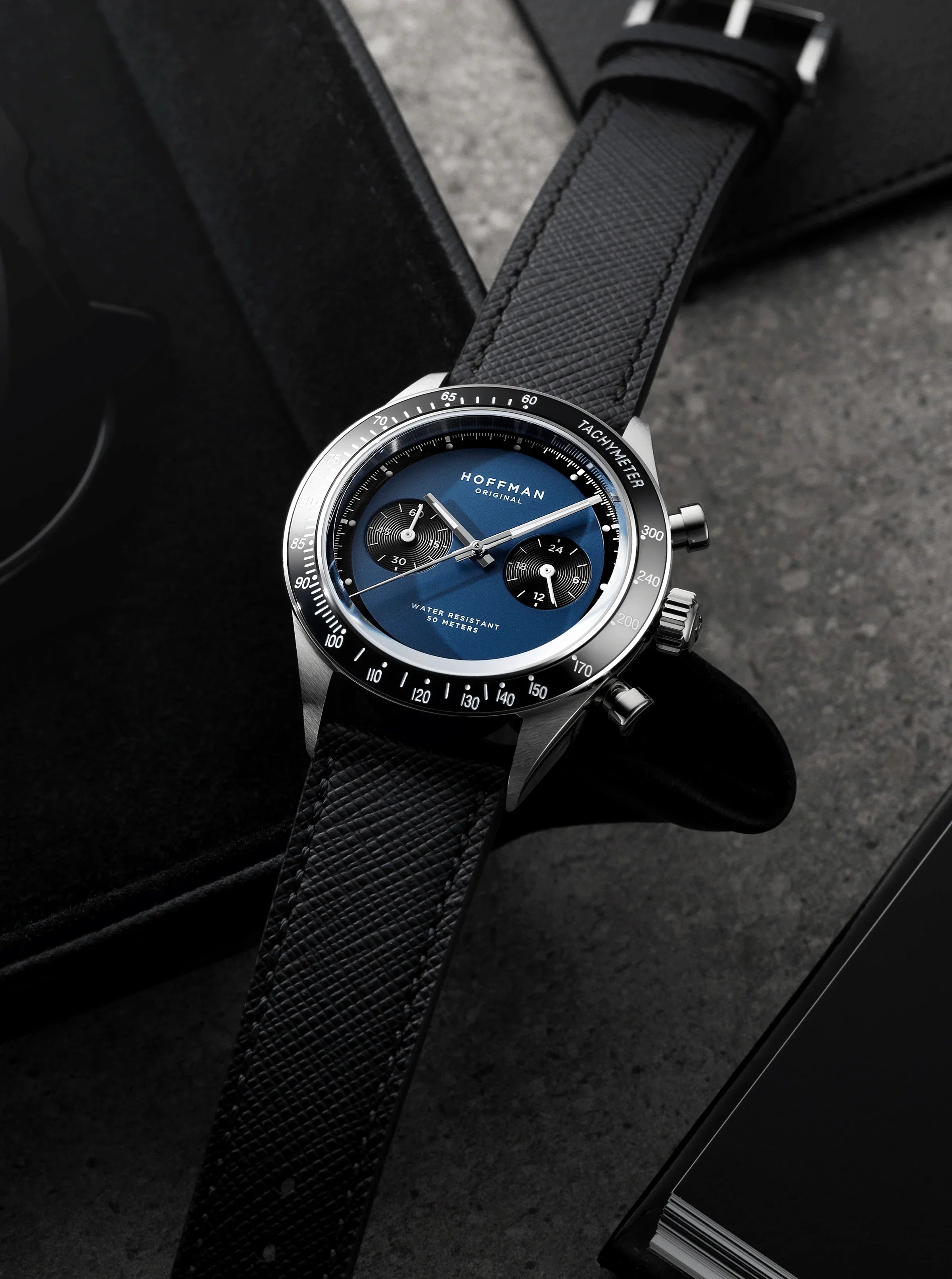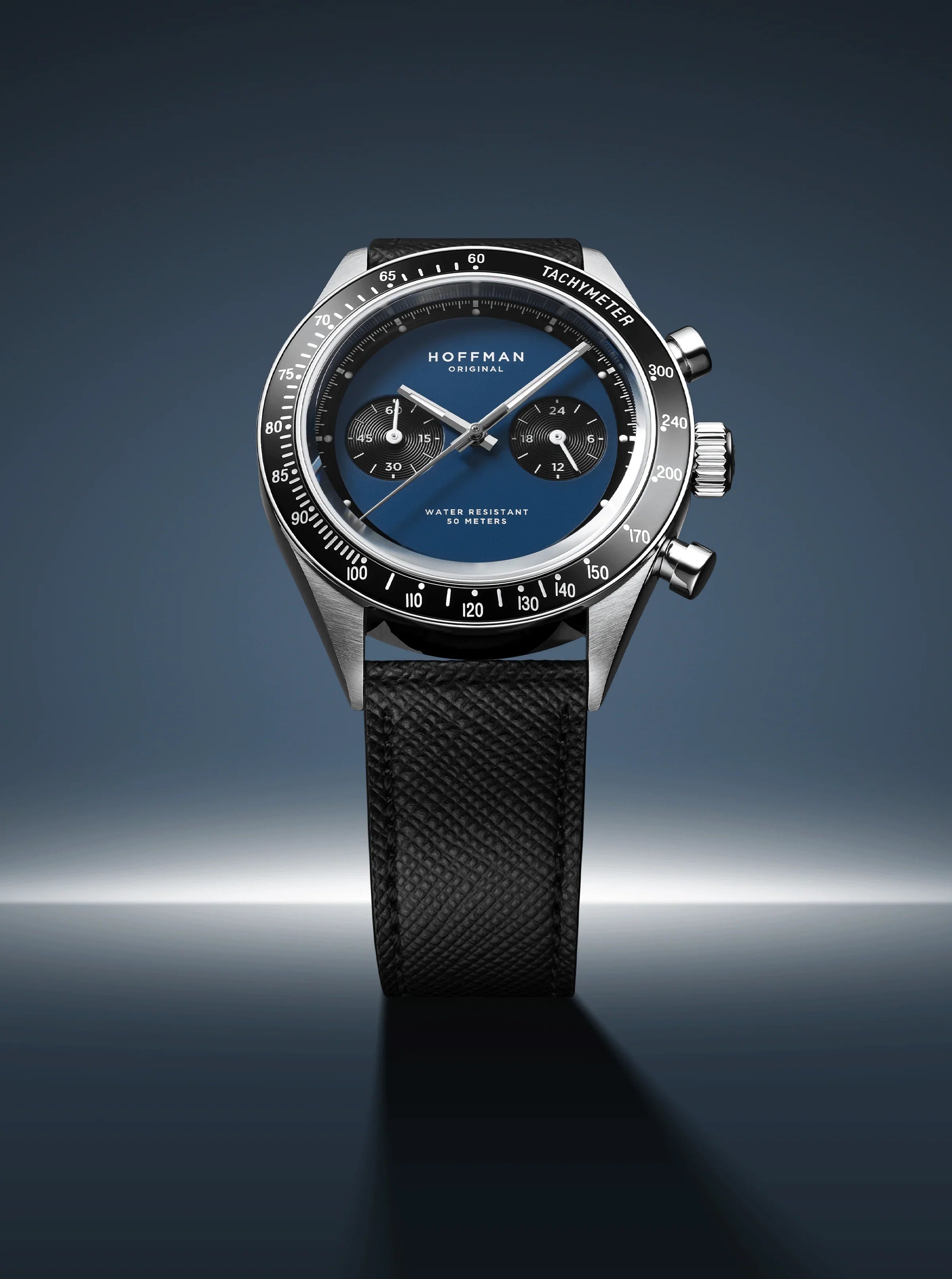 Elle est dotée d'un boîtier en acier inoxydable poli et brossé, agrémenté d'une lunette noire polie avec échelle tachymétrique gravée. Son cadran double couche, bleu marine profond et noir, est rehaussé de textures circulaires en relief qui apportent profondeur et caractère aux compteurs. Ces derniers affichent les minutes du chronomètre à 9 heures et un indicateur 24 heures à 3 heures.