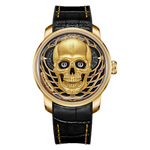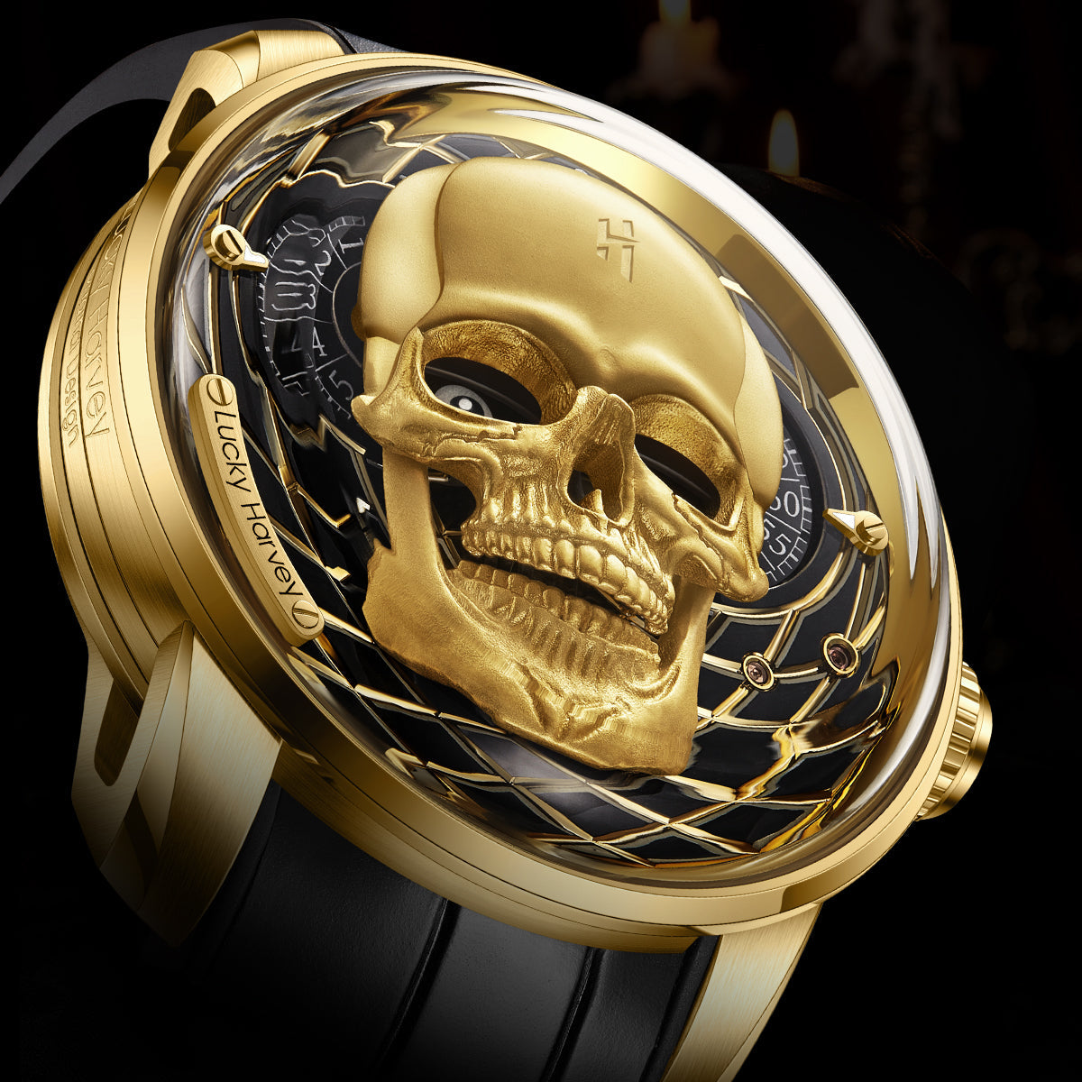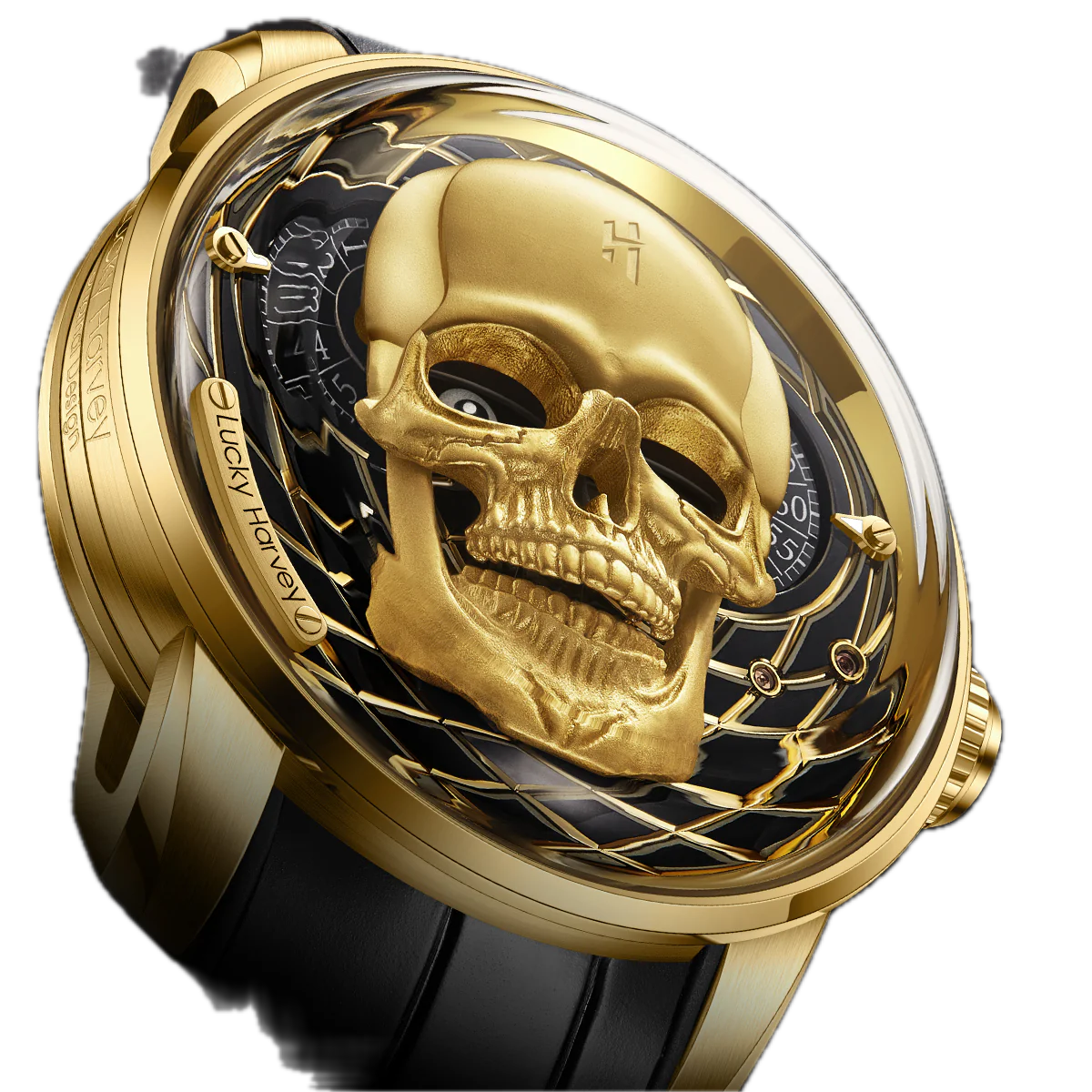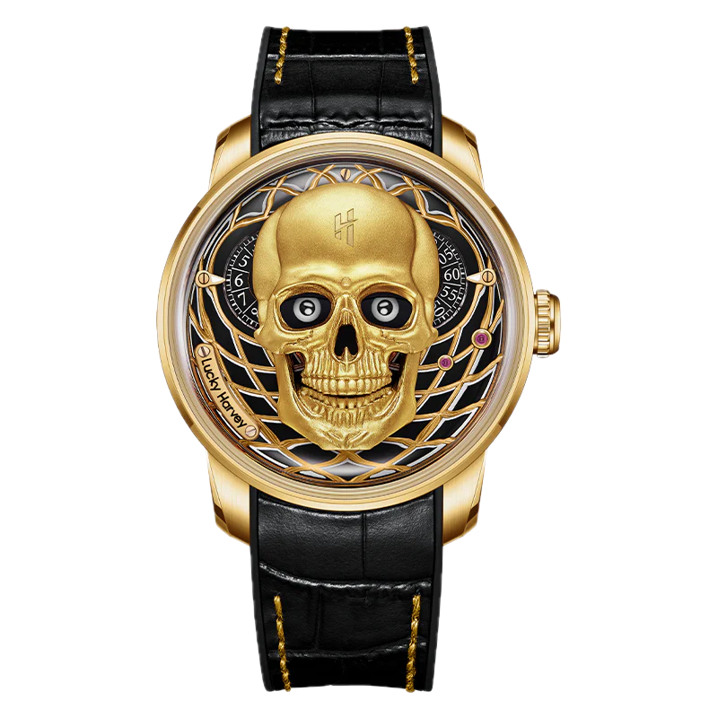 Het Skull Gold horloge van Lucky Harvey belichaamt durf en karakter met een uniek en opvallend ontwerp. Deze gelimiteerde editie van 111 exemplaren heeft een skeletachtige wijzerplaat met een schedelmotief, dat kracht en mysterie symboliseert. De geelgouden kast van roestvrij staal voegt een vleugje moderne luxe toe, terwijl het automatische uurwerk zorgt voor blijvende precisie. Beschermd door krasbestendig saffierglas is dit horloge even robuust als elegant. Voor liefhebbers van zeldzame en fascinerende uurwerken is de Skull Gold een waar verzamelobject. Naarmate het uur verstrijkt, opent en sluit de centrale schedel zijn ogen en mond.