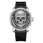 Het Lucky Harvey's Skull Silver horloge belichaamt durf en karakter met een uniek en opvallend ontwerp. Deze gelimiteerde editie van 111 exemplaren heeft een skeletachtige wijzerplaat met een schedelmotief, dat kracht en mysterie symboliseert. De roestvrijstalen kast voegt een moderne touch toe, terwijl het automatische uurwerk zorgt voor blijvende precisie. Beschermd door krasbestendig saffierglas is dit horloge even robuust als elegant. Voor liefhebbers van zeldzame en fascinerende uurwerken is de Skull Steel een waar verzamelobject. Naarmate het uur verstrijkt, opent en sluit de centrale schedel zijn ogen en mond.