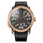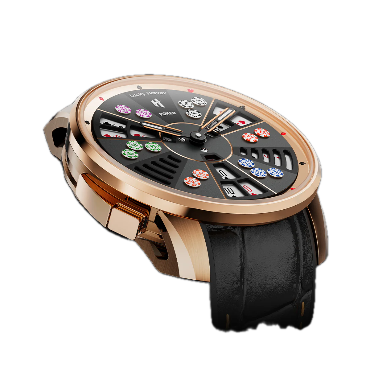 Het Lucky Harvey Three Card Poker Rose Gold horloge combineert elegantie met een passie voor het spel. Geïnspireerd door het pokerspel met drie kaarten, heeft dit horloge een unieke wijzerplaat die de wereld van kaarten uitbeeldt, perfect voor casinoliefhebbers en liefhebbers van verfijning. Uitgerust met een hoogwaardig automatisch uurwerk, garandeert het langdurige, compromisloze precisie. De roestvrijstalen kast met roségouden PVD-behandeling en krasbestendig saffierglas geven dit horloge ongeëvenaarde kracht en elegantie. De Three Card Poker Silver is ideaal voor wie op zoek is naar een gedurfde stijl en een vleugje karakter. Het roulettesysteem maakt het mogelijk om, door op de pusher op 8 uur te drukken, willekeurig 3 handen van 3 kaarten te trekken voor een pokerspel met 3 personen. De eerste hand op 2 uur vertegenwoordigt de hand van de eerste speler, die op 6 uur die van de tweede speler en die op 10 uur de hand van de derde speler. De kaartenschijf is beschilderd met lichtgevend materiaal.