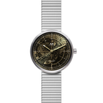 Daarom hebben we ervoor gekozen om samen te werken met het kunstenaarsduo uit Bordeaux om een gloednieuwe wijzerplaat in geborsteld messing en twee over elkaar heen liggende kleuren aan te bieden, die doet denken aan hun monumentale fresco van 150 vierkante meter in Le Locle, Zwitserland. Dit werk maakt deel uit van de viering van het 10-jarig bestaan van UNESCO. De twee kunstenaars gebruikten sjablonen en spuitverf om dit fresco te creëren. Vervolgens werkten ze het af met een penseel. Dit schilderij roept de geschiedenis van de tijd en de beheersing ervan op. Maar het combineert ook een metafysische en religieuze toets.