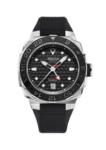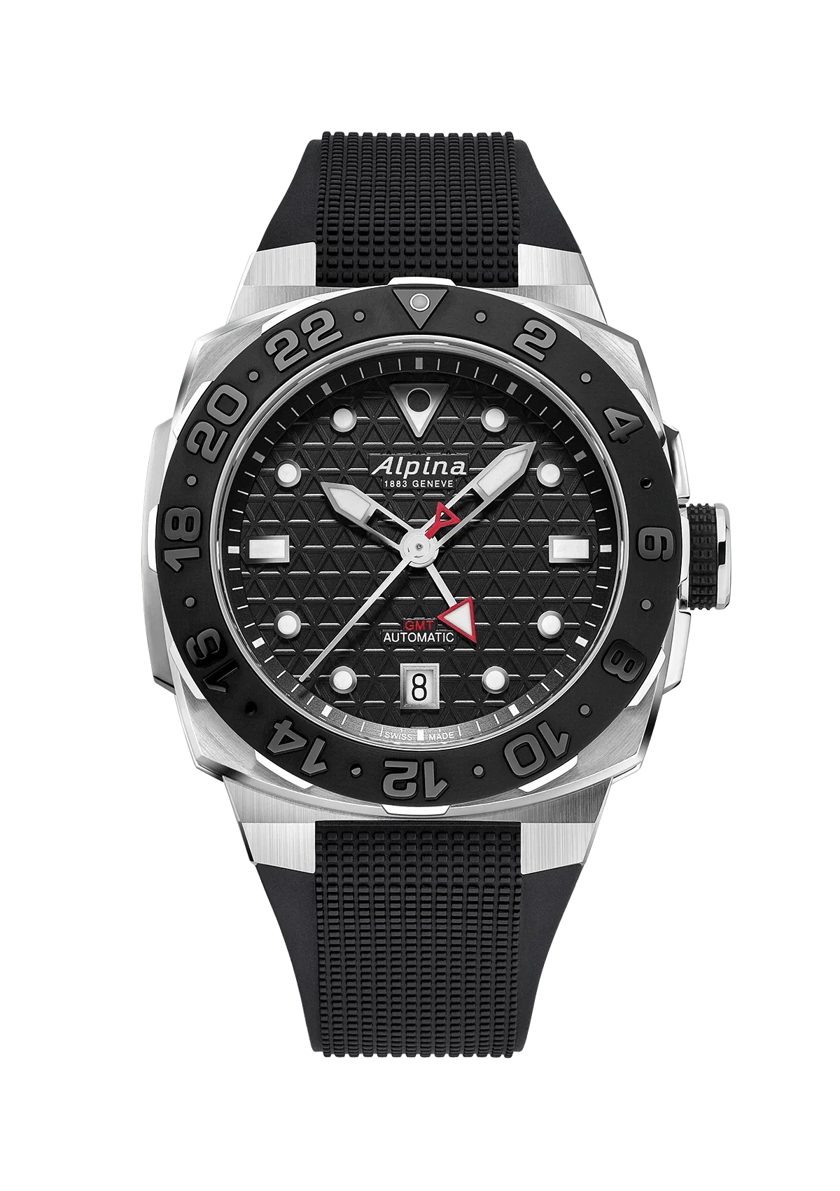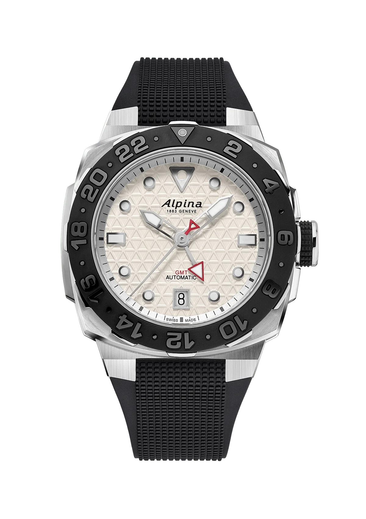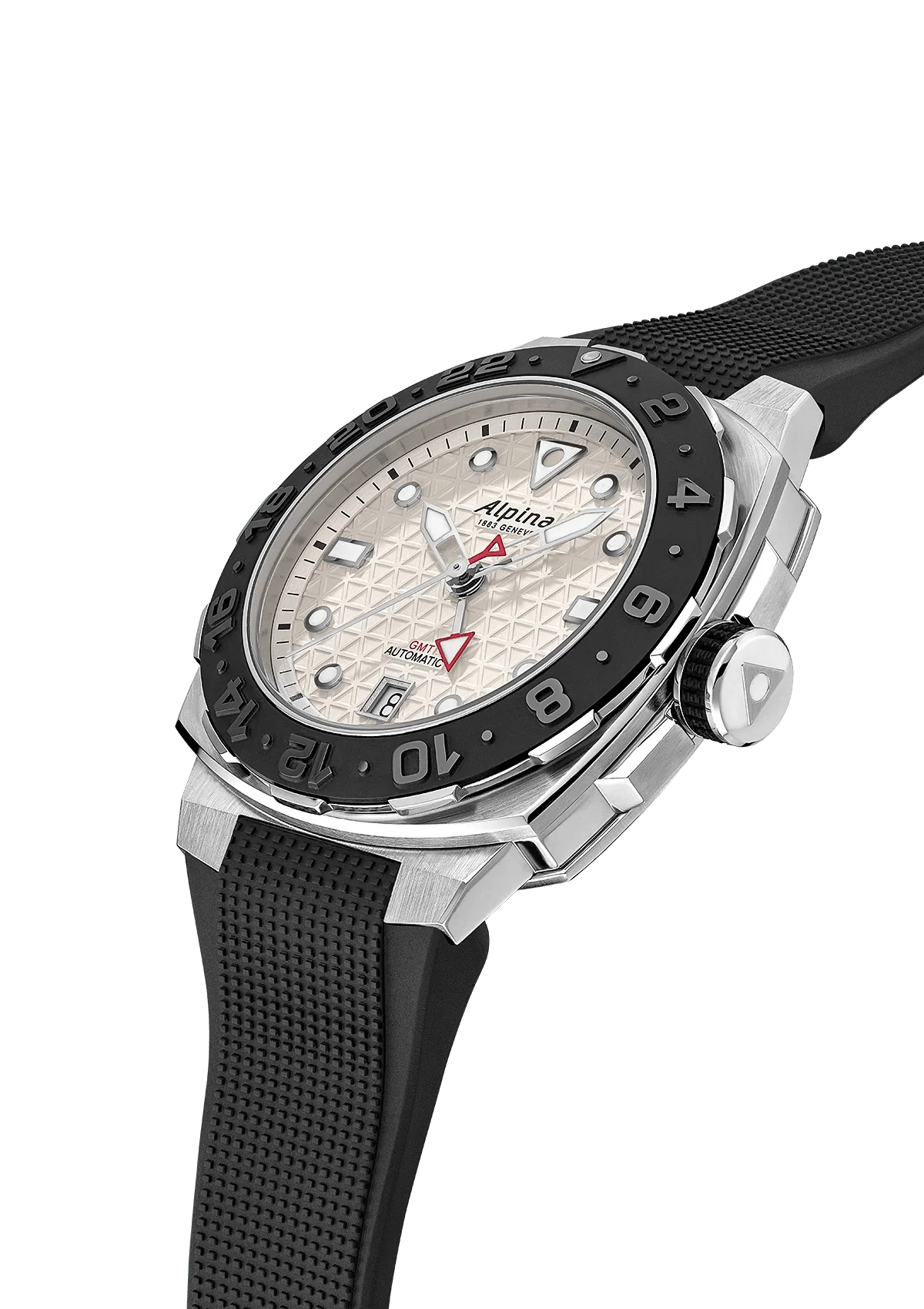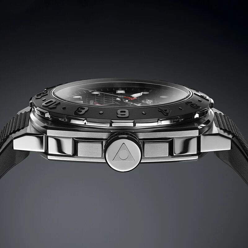 Gepolijste zilveren GMT-wijzer met rode driehoek gevuld met witte lichtgevende behandeling