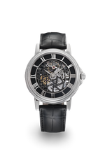 Roestvrijstalen kast, Ø 42 mm, automatisch opwindbaar, skelet, saffierglas boven, kristallen achterkant, waterbestendig tot 5 atm, leren band, zwarte rand met rhodium-plated Romeinse cijfers