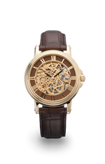 Kast van 10μ geelgoud verguld, Ø 42 mm, automatisch opwinden, skelet, saffierglas boven, kristallen achterkant, waterbestendig tot 5 atm, leren band, bruine Romeinse cijferrand, gouden aangebrachte hoofdstukken