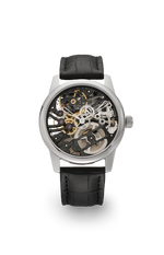 Roestvrijstalen kast, Ø 42 mm, handopwindbaar, skelet, saffierglas aan de bovenkant, kristallen achterkant, waterbestendig tot 3 atm, leren band, zonder flens