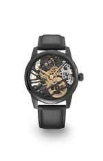 Roestvrijstalen kast met zwarte PVD-coating, Ø 42 mm, handopwindbaar, skelet, saffierglas aan de bovenkant, kristallen achterkant, waterbestendig tot 3 atm, leren band, zonder flens