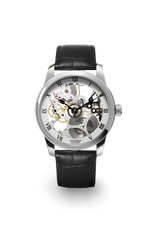 Roestvrijstalen kast, Ø 42 mm, handopwindbaar, skelet, saffierglas aan de bovenkant, kristallen achterkant, waterbestendig tot 3 atm, leren band, witte rand, Romeinse cijfers