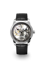 Roestvrijstalen kast, Ø 42 mm, handopwindbaar, skelet, saffierglas aan de bovenkant, kristallen achterkant, waterbestendig tot 3 atm, leren band, grijze flens, Romeinse cijfers