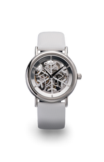 Roestvrijstalen kast, Ø 35 mm, handopwindbaar, skelet, witte sneeuwvlokwijzerplaat, zilvergrijze ring, saffierglas erboven, kristallen achterkant, waterbestendig 3 atm