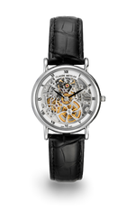 Roestvrijstalen kast, Ø 35 mm, automatisch opwindbaar, skelet, saffierglas boven, kristal achterkant, waterbestendig tot 3 atm, leren band, witte Romeinse cijfers op de rand