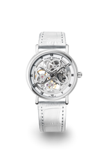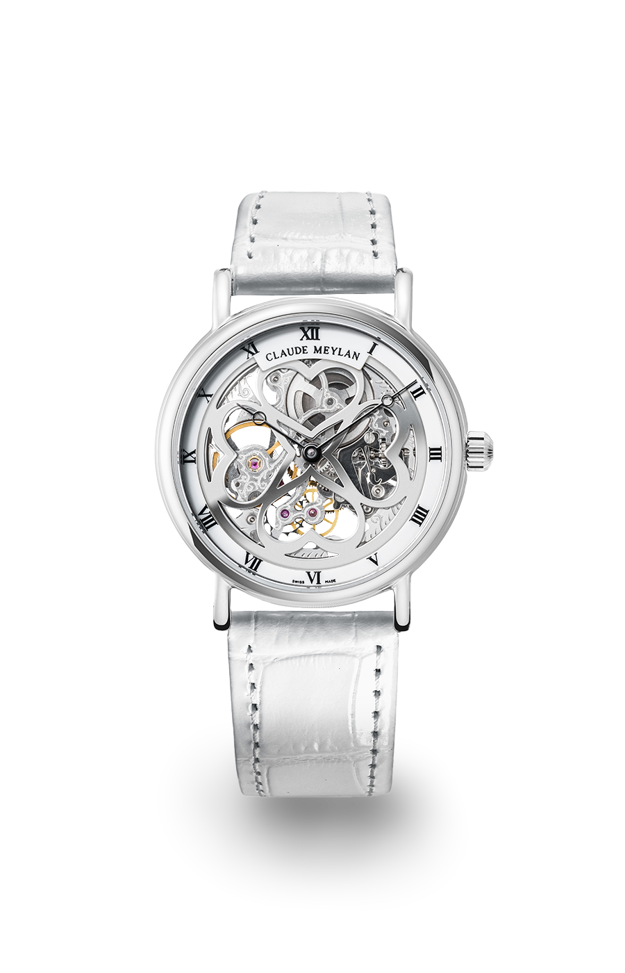 Roestvrijstalen kast, Ø 35 mm, automatisch opwindbaar, skelet, hartvormige wijzerplaat, saffierglas erboven, kristallen achterkant, waterbestendig tot 3 atm, leren/satijnen band, Romeinse cijfers