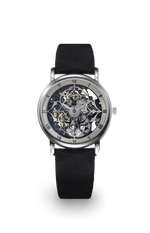Roestvrijstalen kast, Ø 35 mm, automatisch opwinden, skelet, oosterse wijzerplaat, saffierglas boven, kristallen achterkant, waterbestendig 3 atm, leren/satijnen band, Romeinse cijfers