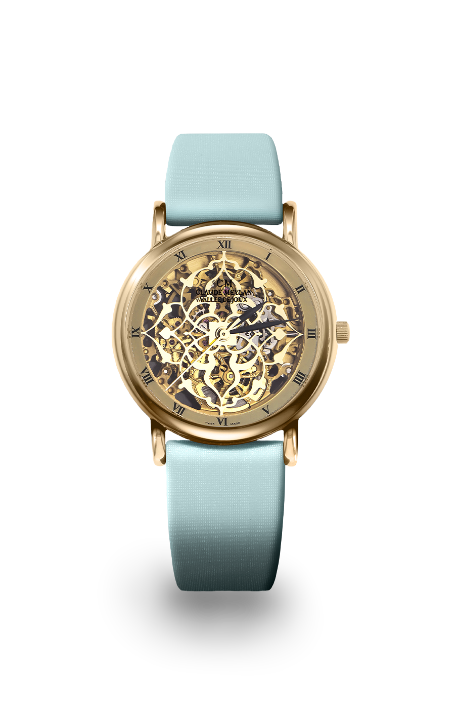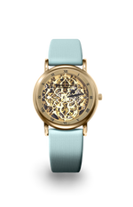Kast van 10μ geelgoud verguld, Ø 35 mm, automatisch opwinden, skelet, oosterse wijzerplaat, saffierglas boven, kristal achter, waterbestendig 3 atm, leren/satijnen band, Romeinse cijfers