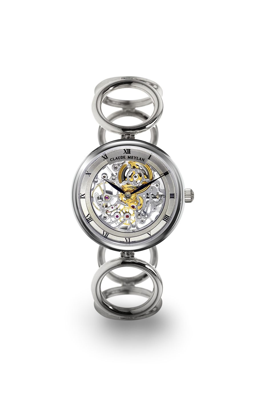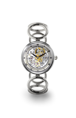 Roestvrijstalen kast, Ø 35 mm, handopwindbaar, skelet, saffierglas boven, kristal achterkant, waterbestendig tot 3 atm, skeletband, grijze Romeinse cijfers op de rand