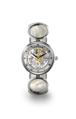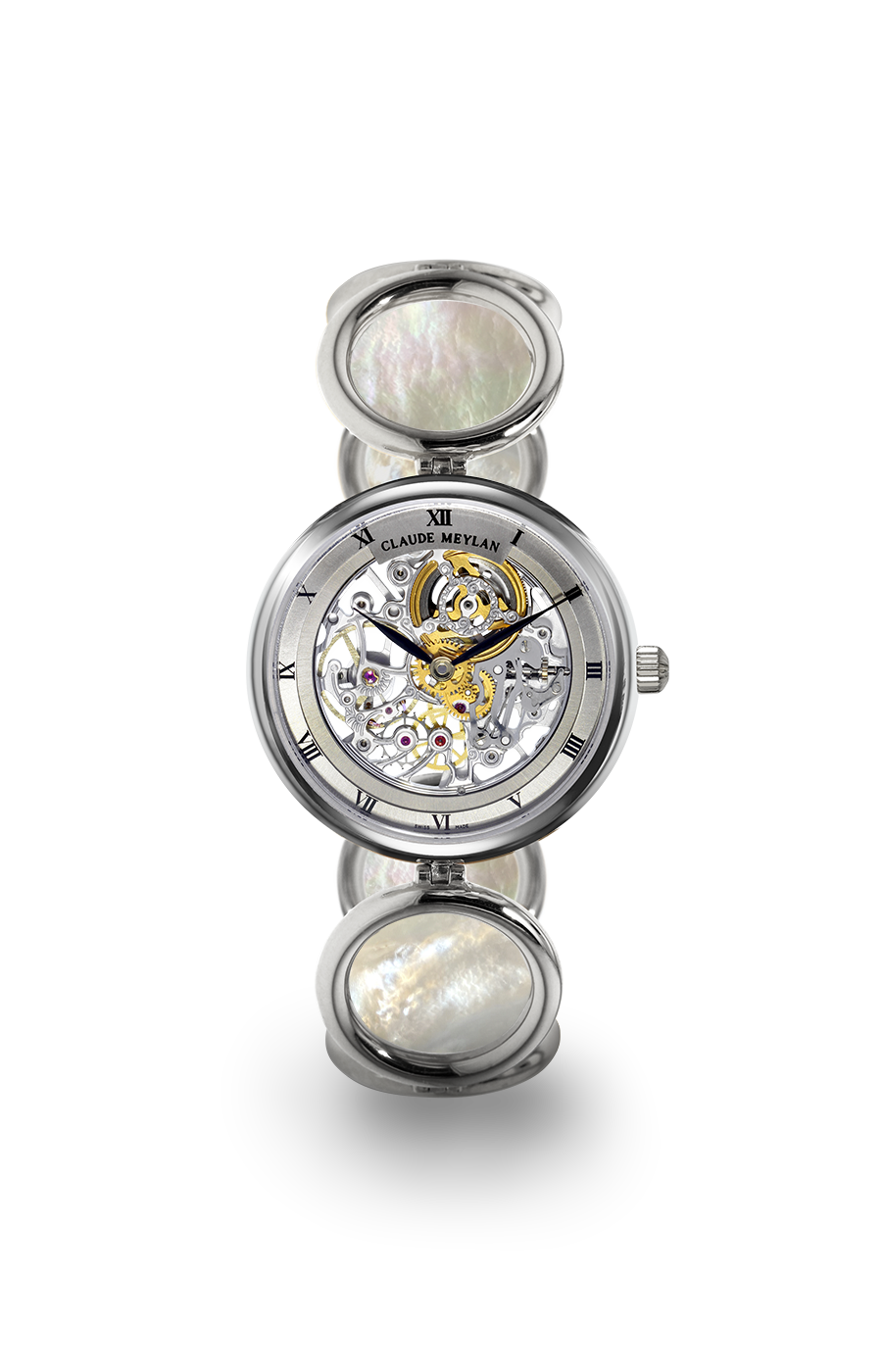 Omschrijving Kast van roestvrij staal, Ø 35 mm, handopwindbaar, skelet, saffierglas boven, kristal achterkant, waterbestendig tot 3 atm, skeletband van echt parelmoer, flens met grijze Romeinse cijfers
