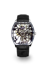 Roestvrijstalen kast, 40 mm op de 3/9-as, handopwindbaar, skelet, lunette en saffierglas aan de bovenkant, kristallen achterkant, leren band, zwart uurwerk