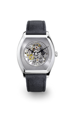 Roestvrijstalen kast, 40 mm op as 3/9, automatisch opwindbaar, skelet, saffierglas bovenop, kristallen achterkant, waterbestendig 3 atm, leren band,
