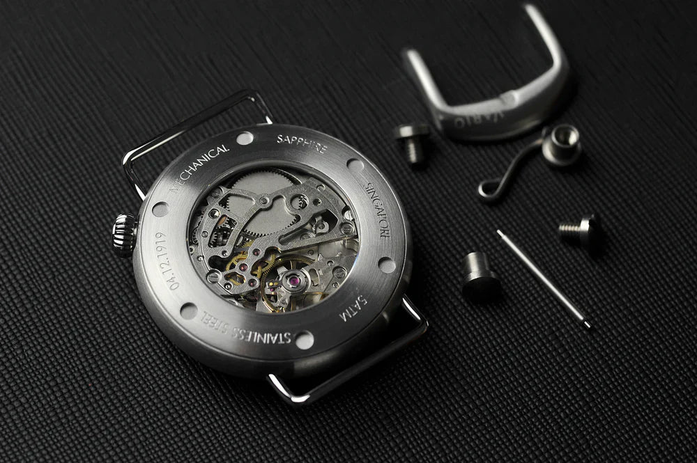 • Achterkant kast : Transparant saffier, biedt zicht op het uurwerk