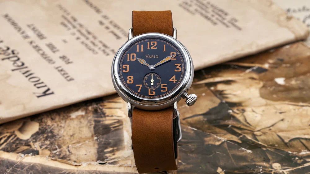 De Vario 1918 Trench is een moderne herinterpretatie van loopgravenhorloges uit de Eerste Wereldoorlog, met verbeterde functies en een eerbetoon aan de eerste herenhorloges van begin 20e eeuw.