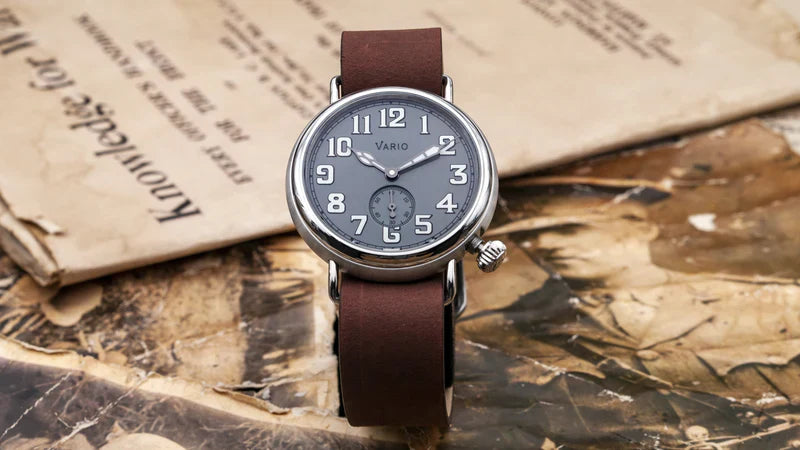 De Vario 1918 Trench is een moderne herinterpretatie van loopgravenhorloges uit de Eerste Wereldoorlog, met verbeterde functies en een eerbetoon aan de eerste herenhorloges van begin 20e eeuw.