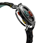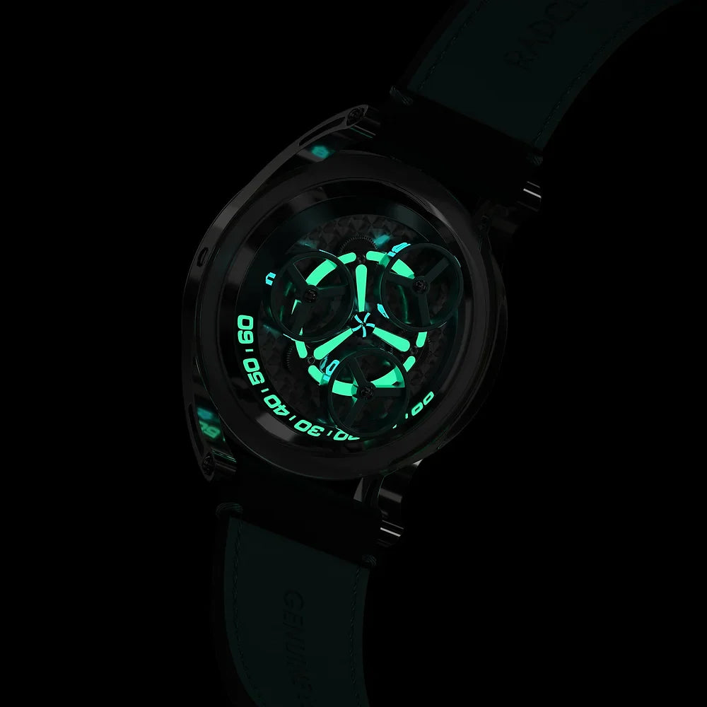 INNOVATIE: De grenzen verleggen om het ALLEREERSTE horloge met variabele tijd en omgekeerde tijd te creëren! +De horlogekast is bijna volledig bedekt met een saffierglas, zowel boven als onder.