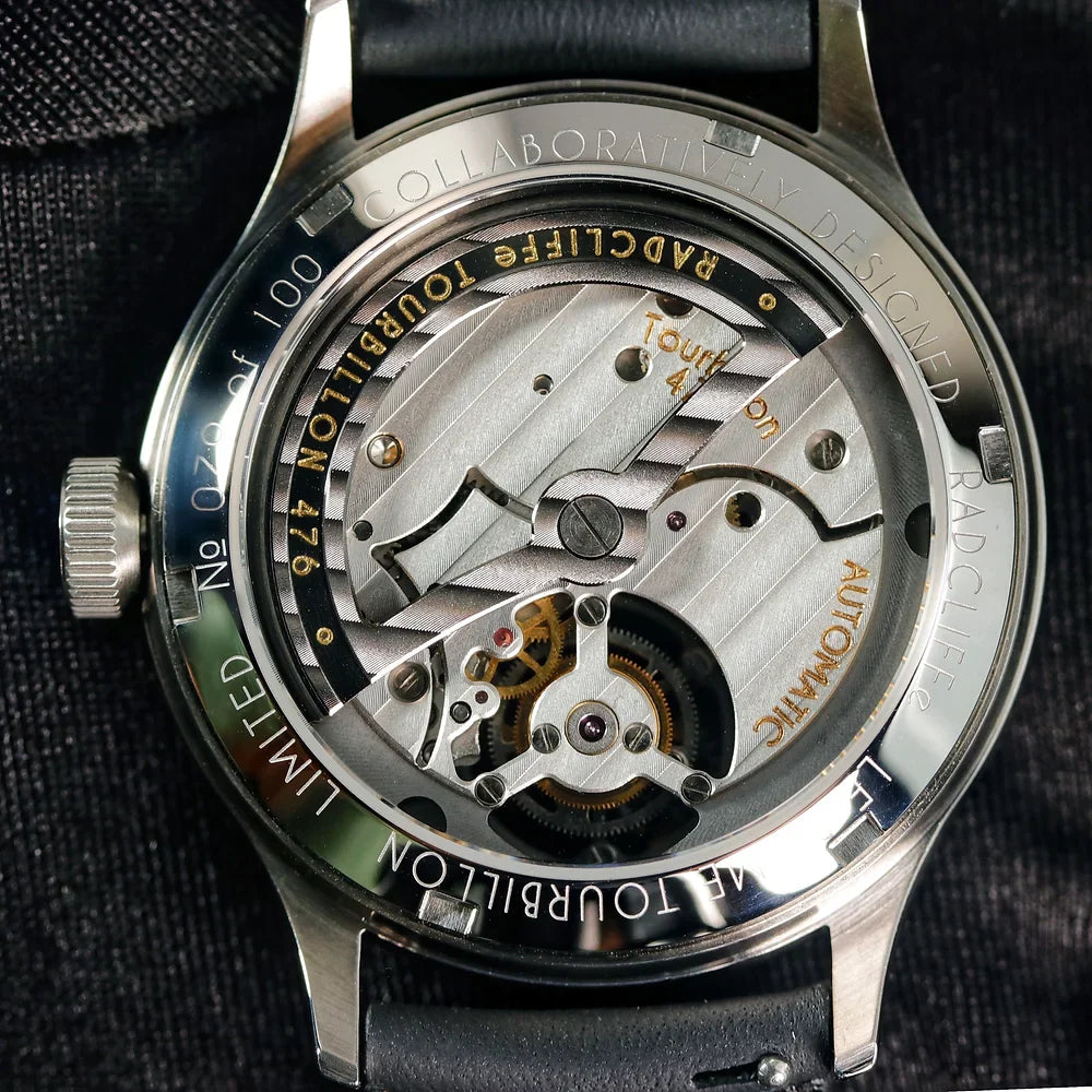 In-house modificatie en update van het uurwerk - Radcliffe 476 vliegend tourbillon-uurwerk met titanium bovenmodule (gebaseerd op een Japanse Miyota 8215)