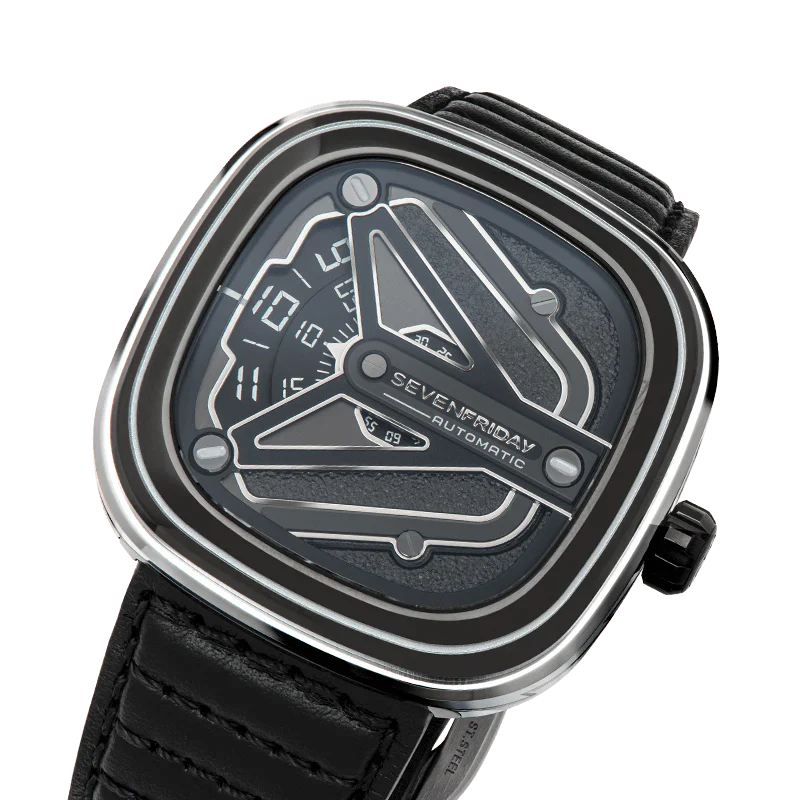 De Y-vormige vleugels zijn gemaakt van een 5-laagse constructie met afwisselend gitzwart polijsten en bronskleurige nerfstempeling. Zeven lagen en 11 aangebrachte onderdelen creëren een meerlaagse interface met een driedimensionaal effect. Drie overlappende witte schijven die de uren, minuten en seconden aangeven, worden van links naar rechts gelezen. En om verwarring te voorkomen, hebben de ontwerpers een blauwe markering toegevoegd.