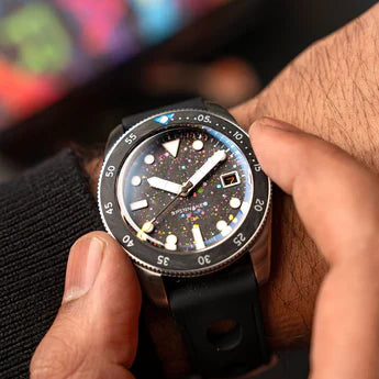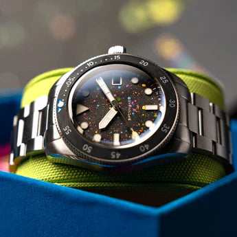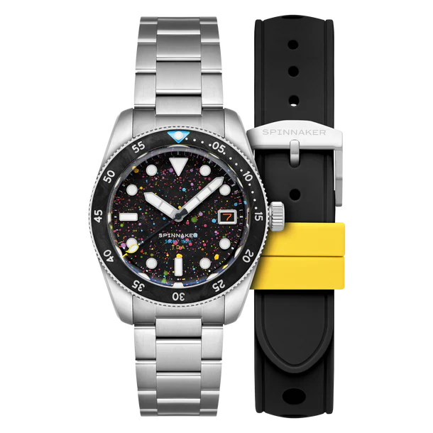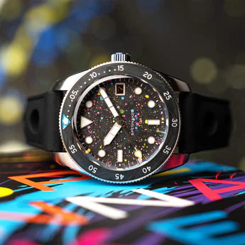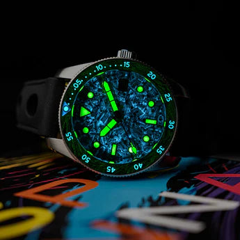 Spinnaker kondigt met trots de samenwerking aan met de beroemde Britse kunstenaar Chris Alexander, ook bekend als "The Dial Artist". Deze unieke collectie toont een gesmede wijzerplaat van koolstofvezel en een lichtgevende verbinding, die de oceaan en de ruimte viert door het prisma van Aurora - het noorderlicht (Aurora Borealis) en bioluminescerend plankton (Aurora of the Sea).