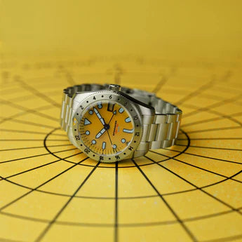 - Wijzerplaat: Geel met aangebrachte indexen en Swiss Super Luminova