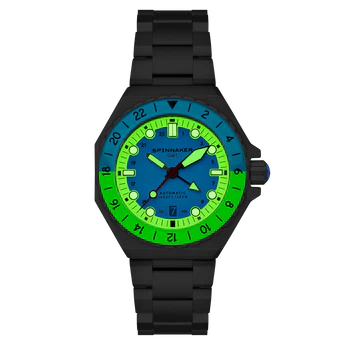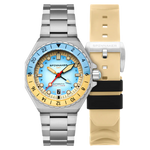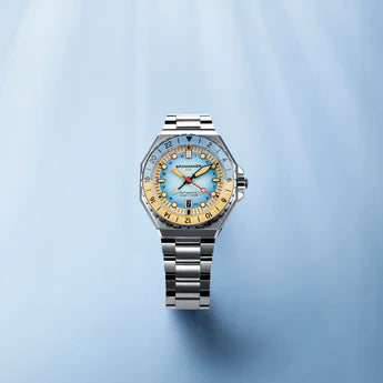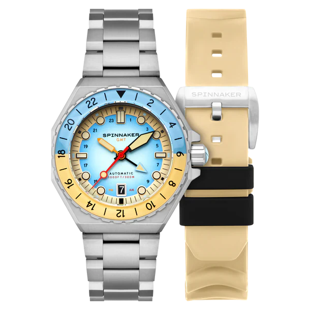 De Dumas GMT is een automatisch horloge, klaar om wereldreizigers te vergezellen, aangedreven door het Seiko NH34 GMT automatische uurwerk. Een gedurfd model dat hoogwaardige horlogemechanismen combineert met de iconische stijl en elegantie van het merk Spinnaker. De massieve, zeshoekige roestvrijstalen band en bijpassende crèmekleurige rubberen band maken het een horloge dat geschikt is voor alle omstandigheden.
