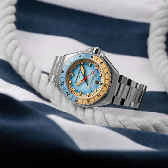 De Dumas GMT is de ideale metgezel voor reis- en watersportliefhebbers. Hij is robuust, functioneel en heeft een stijlvol design.